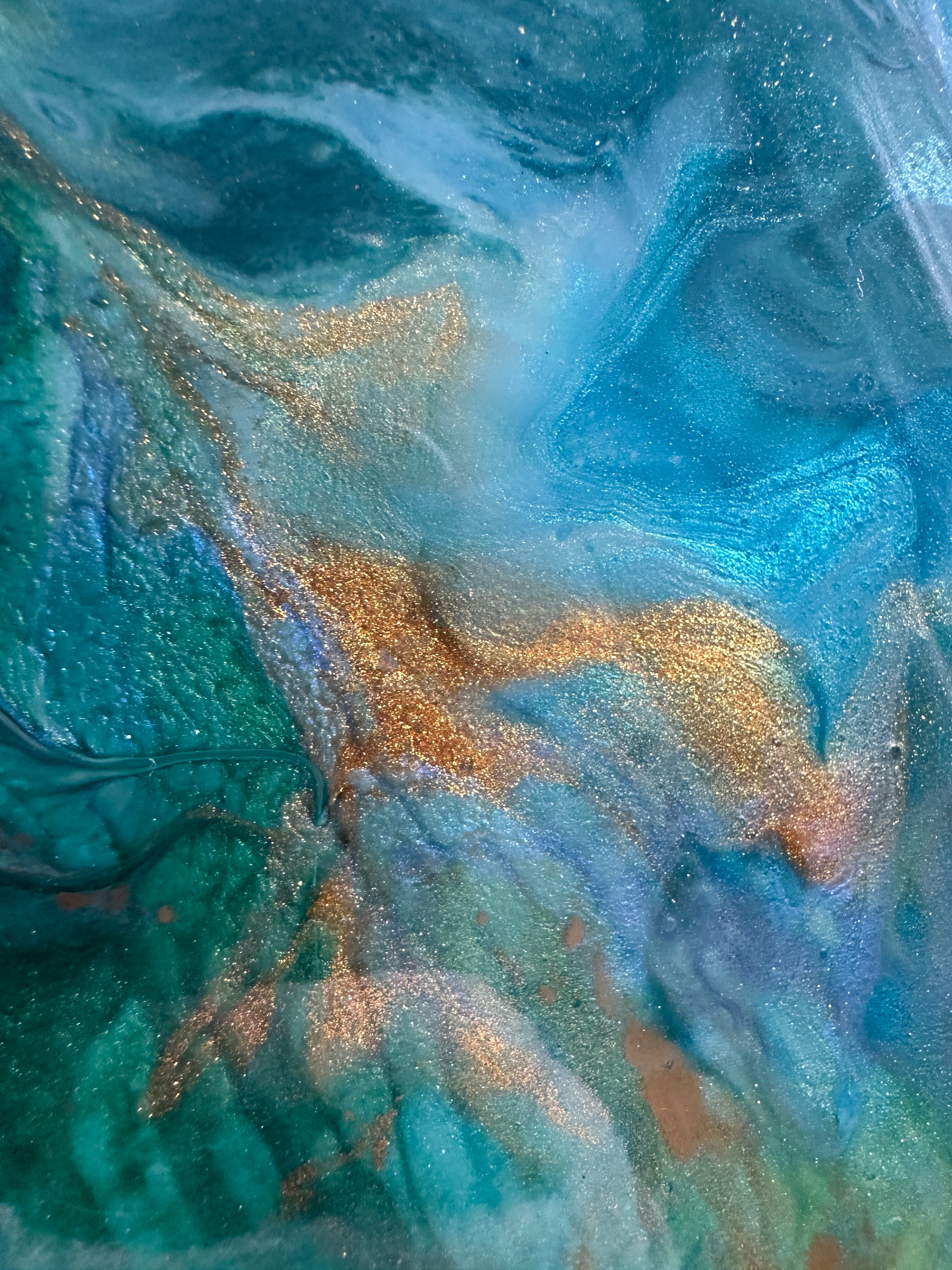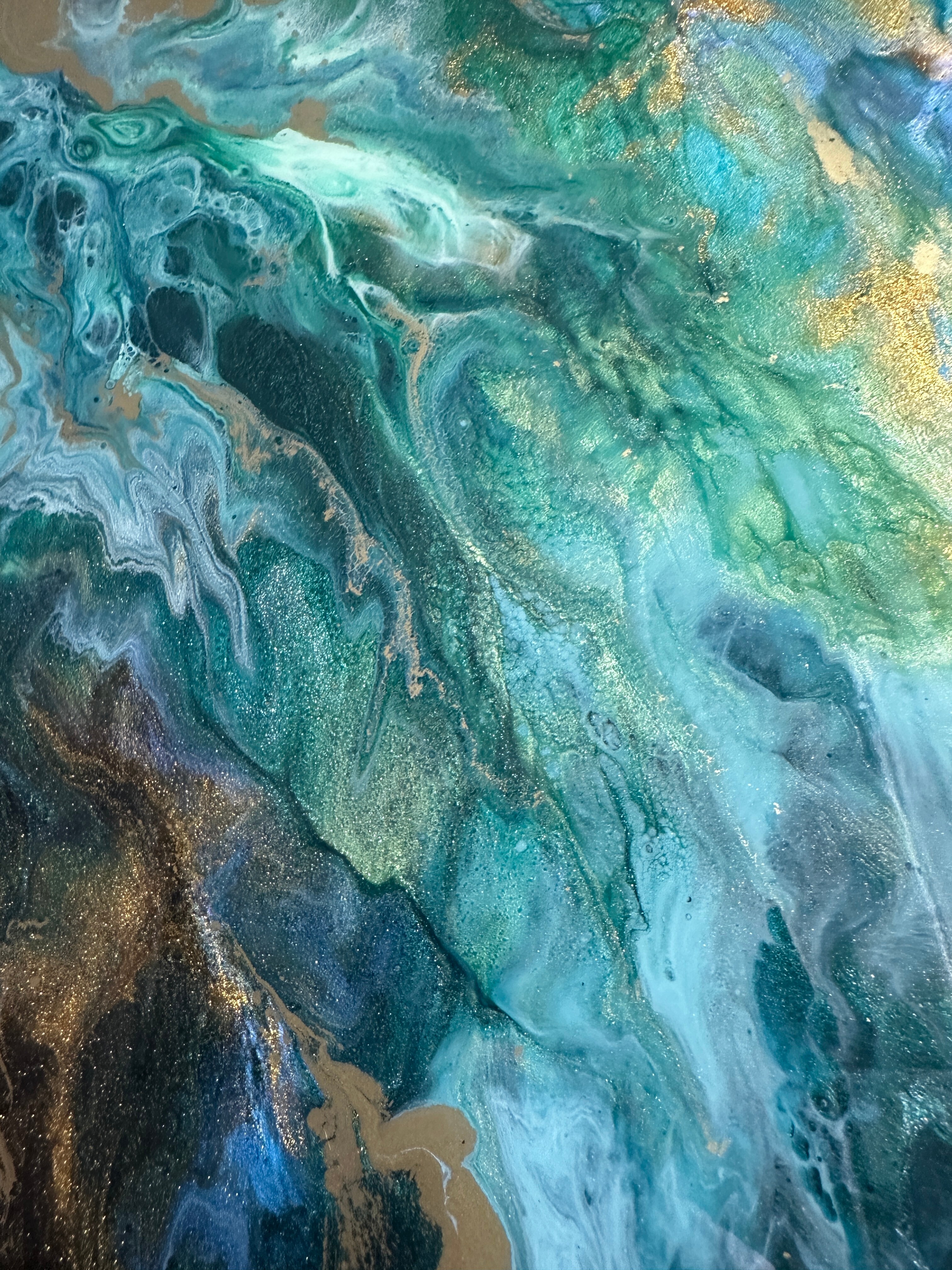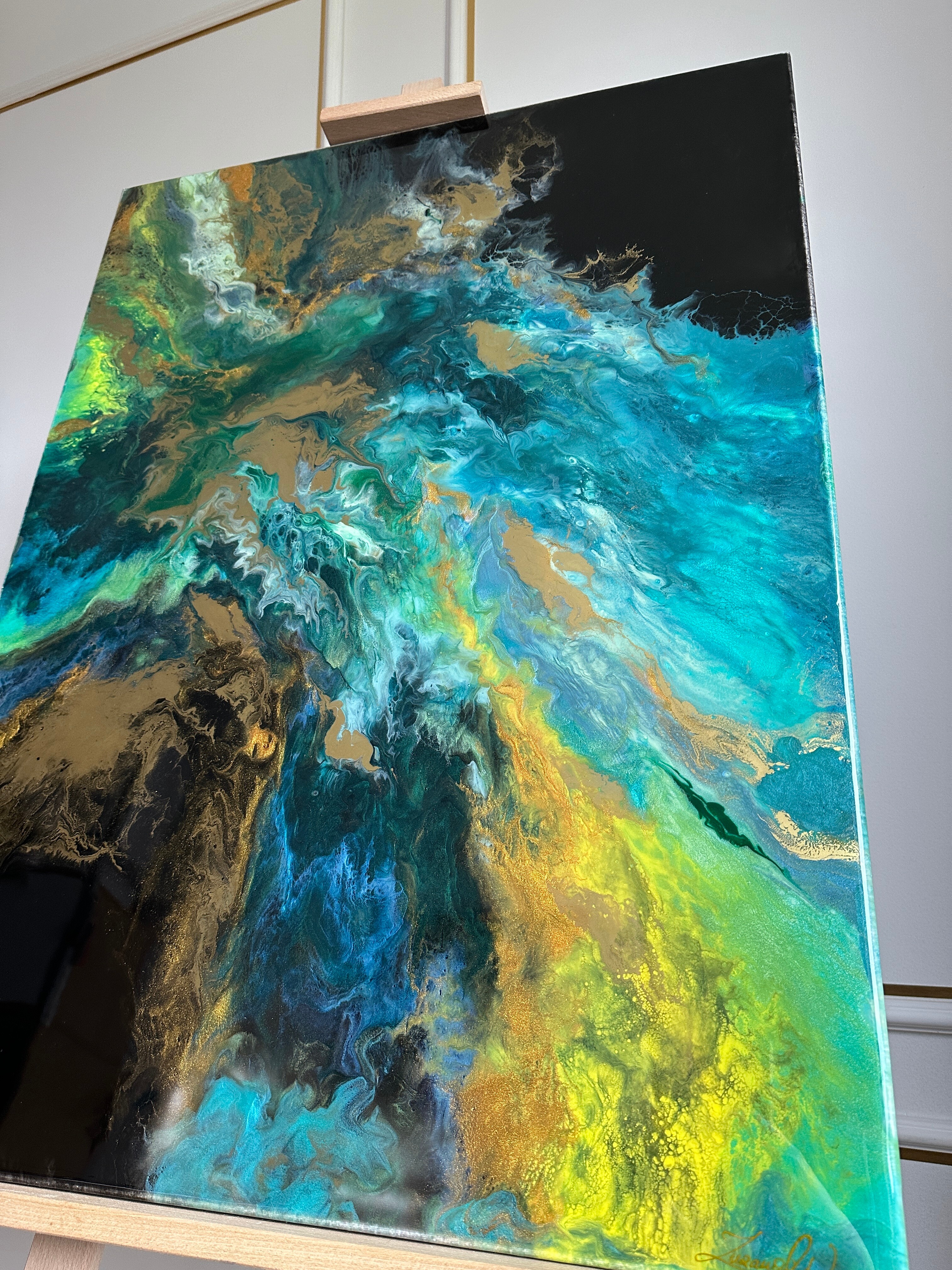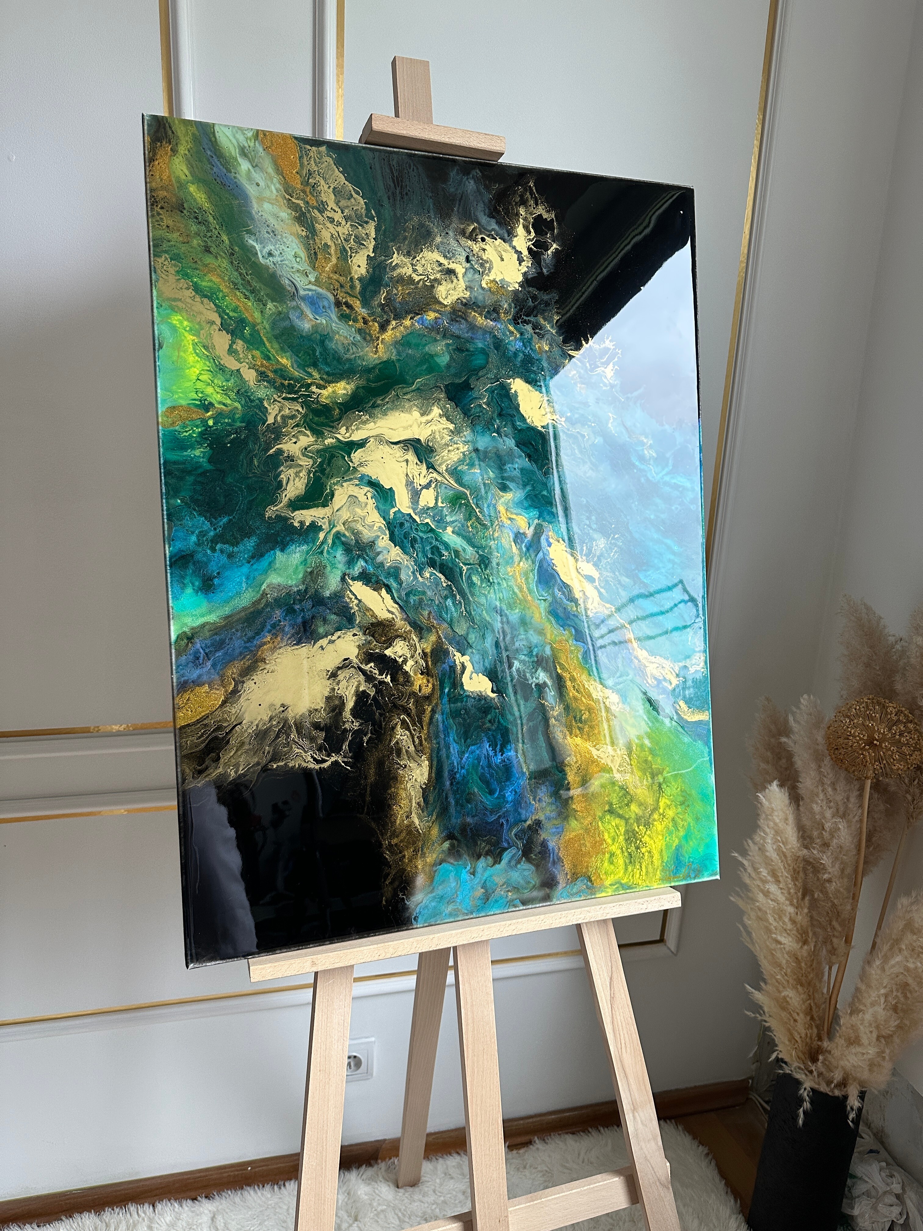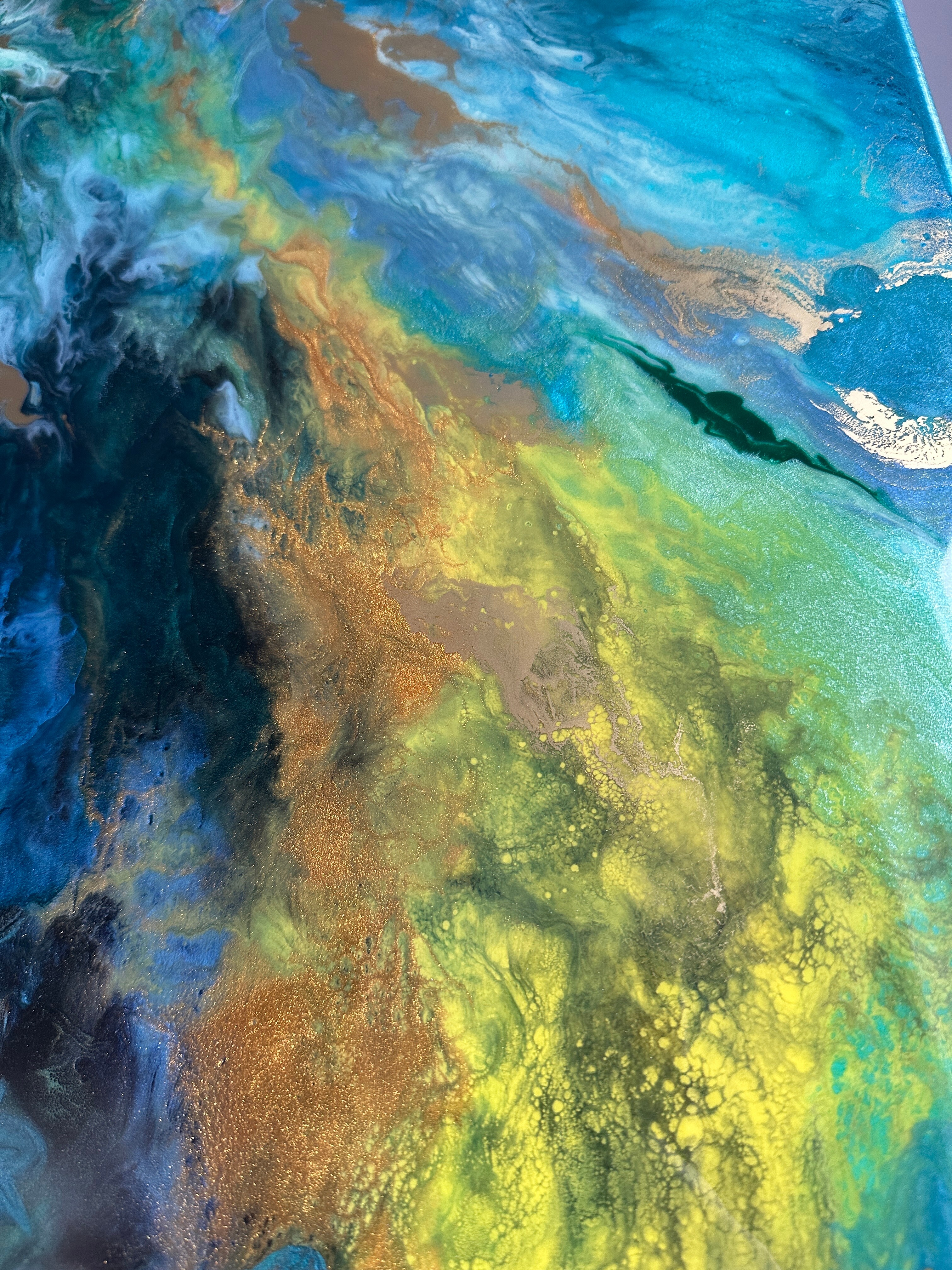 Obraz abstrakcja z żywicy epoksydowej w odcieniach zieleni, niebieskiego z dodatkiem metalicznego złota. Obraz na płótnie -57x77cm