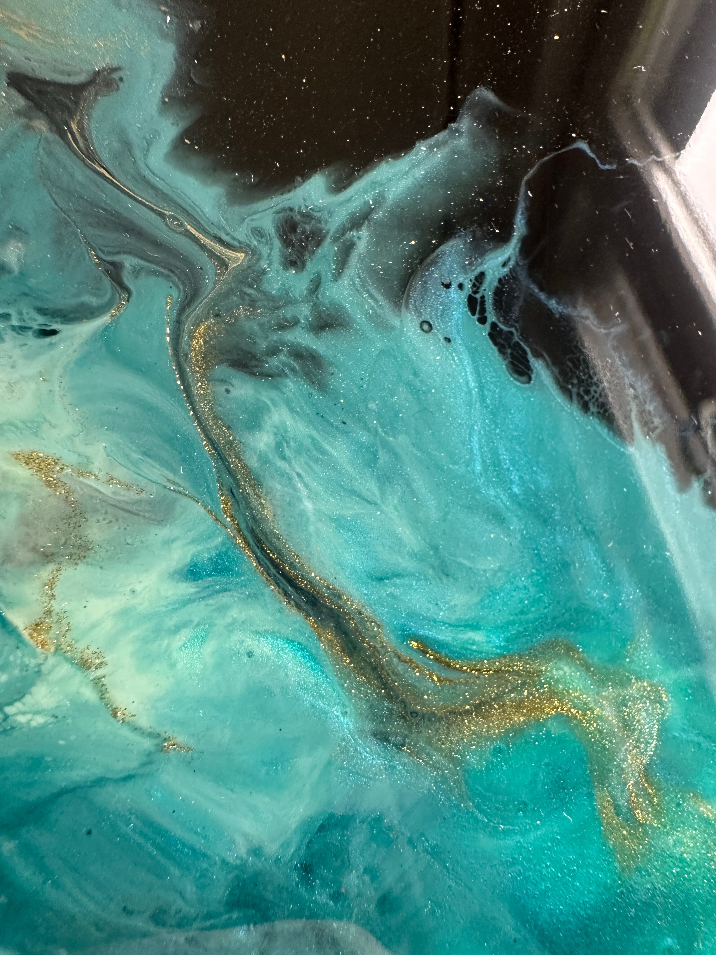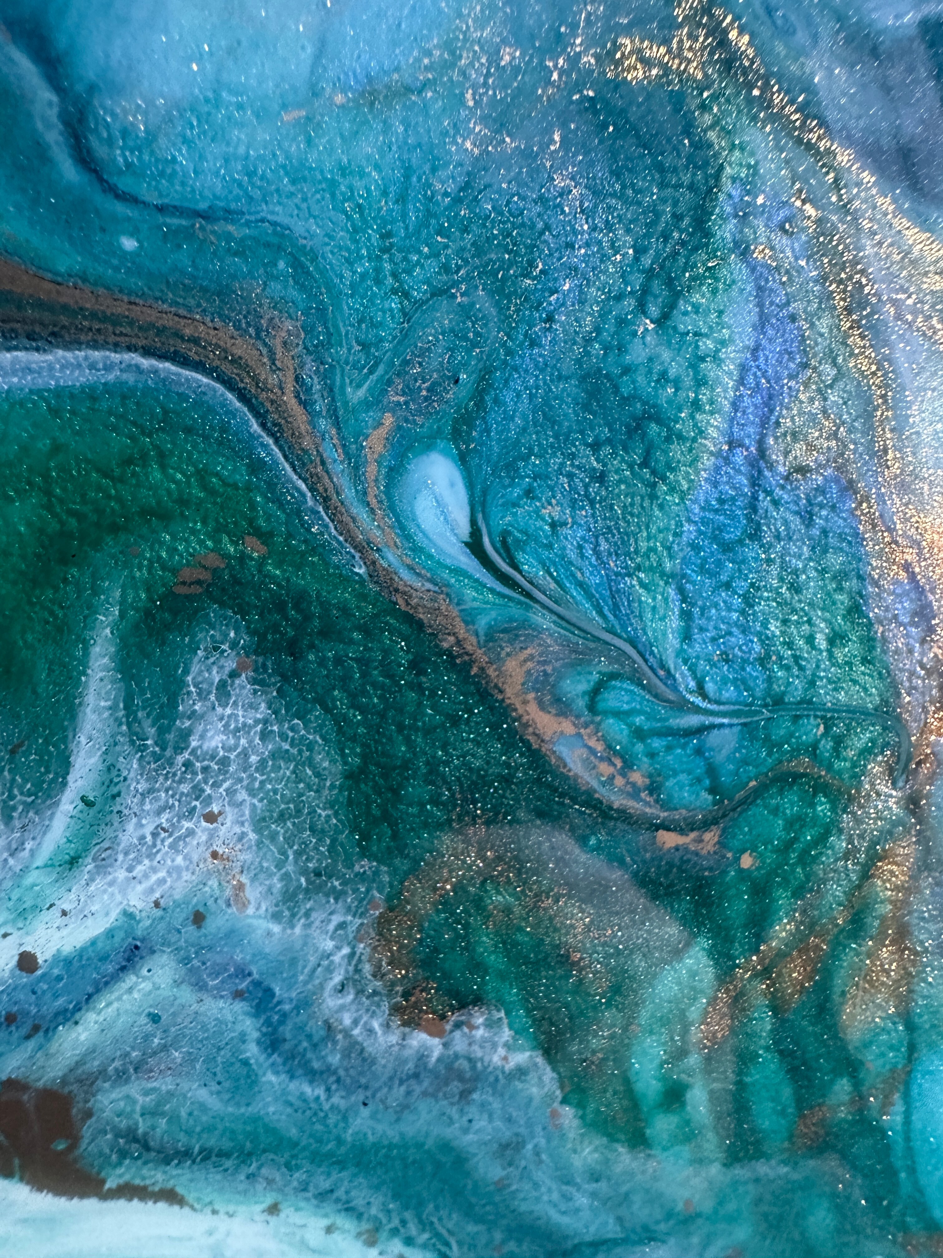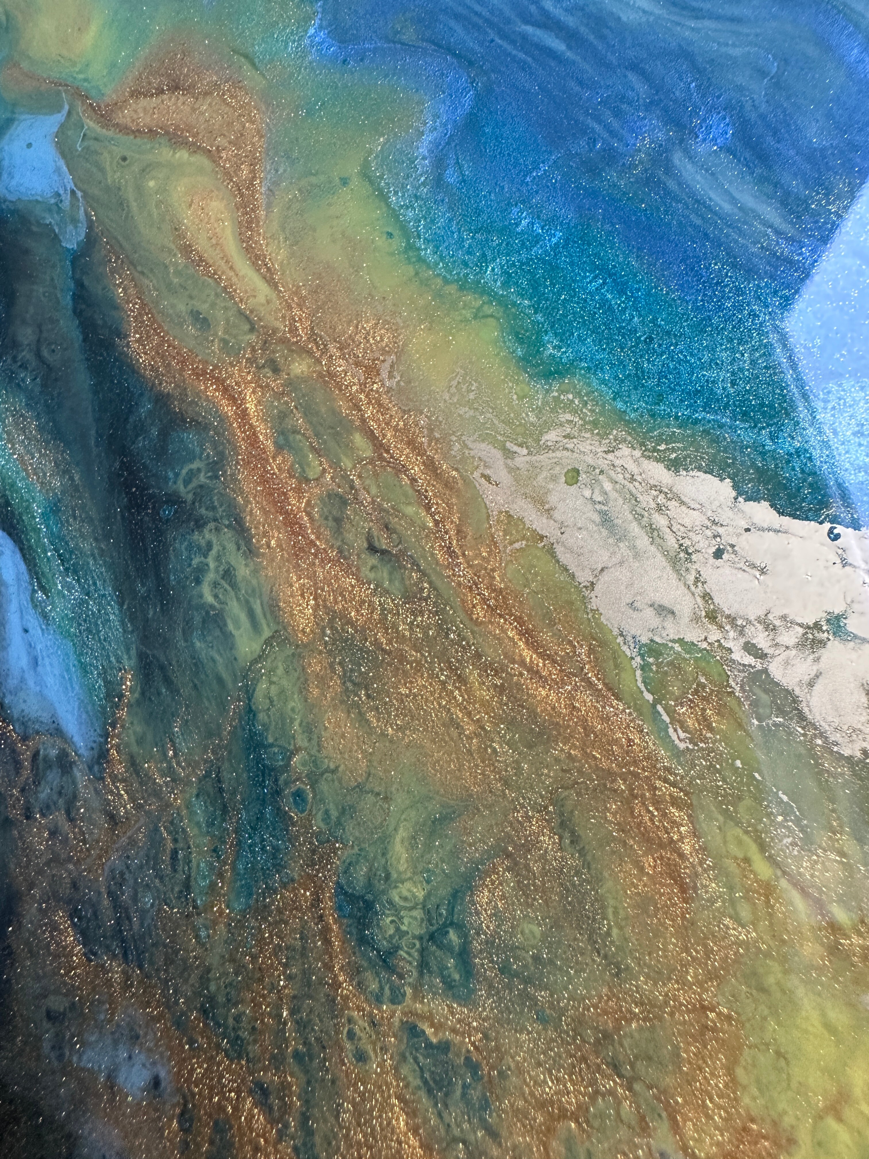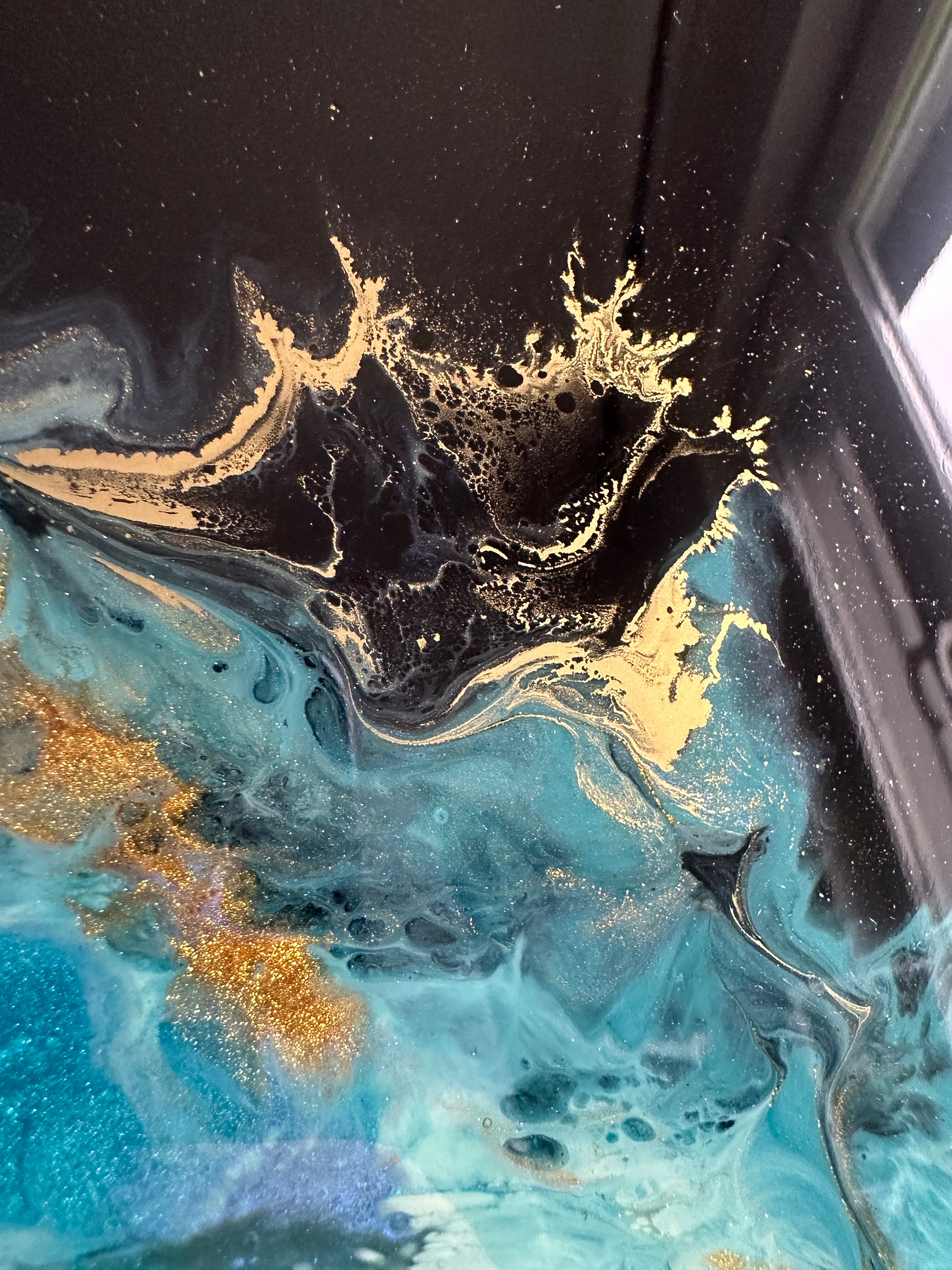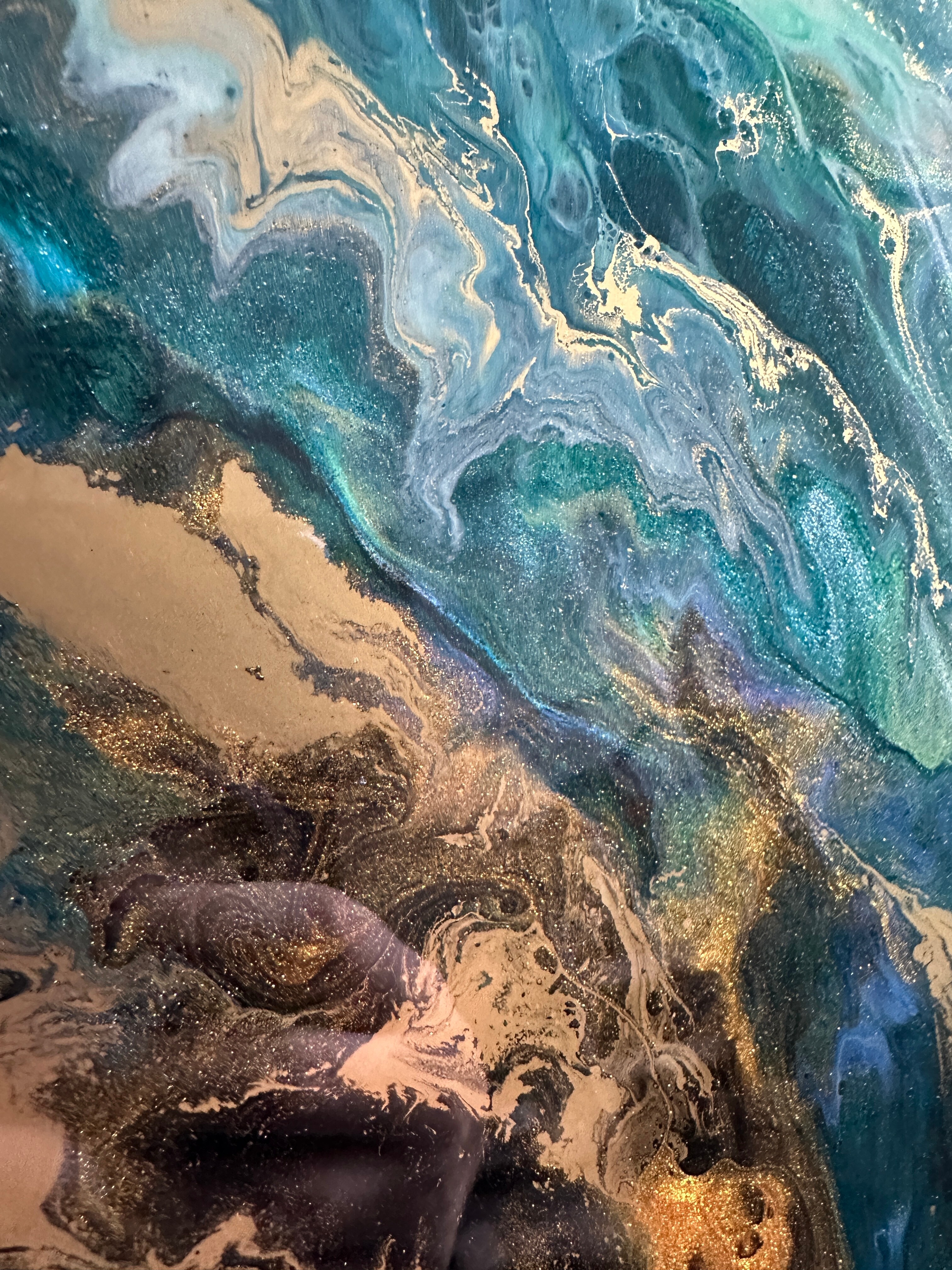 Obraz abstrakcja z żywicy epoksydowej w odcieniach zieleni, niebieskiego z dodatkiem metalicznego złota. Obraz na płótnie -57x77cm
