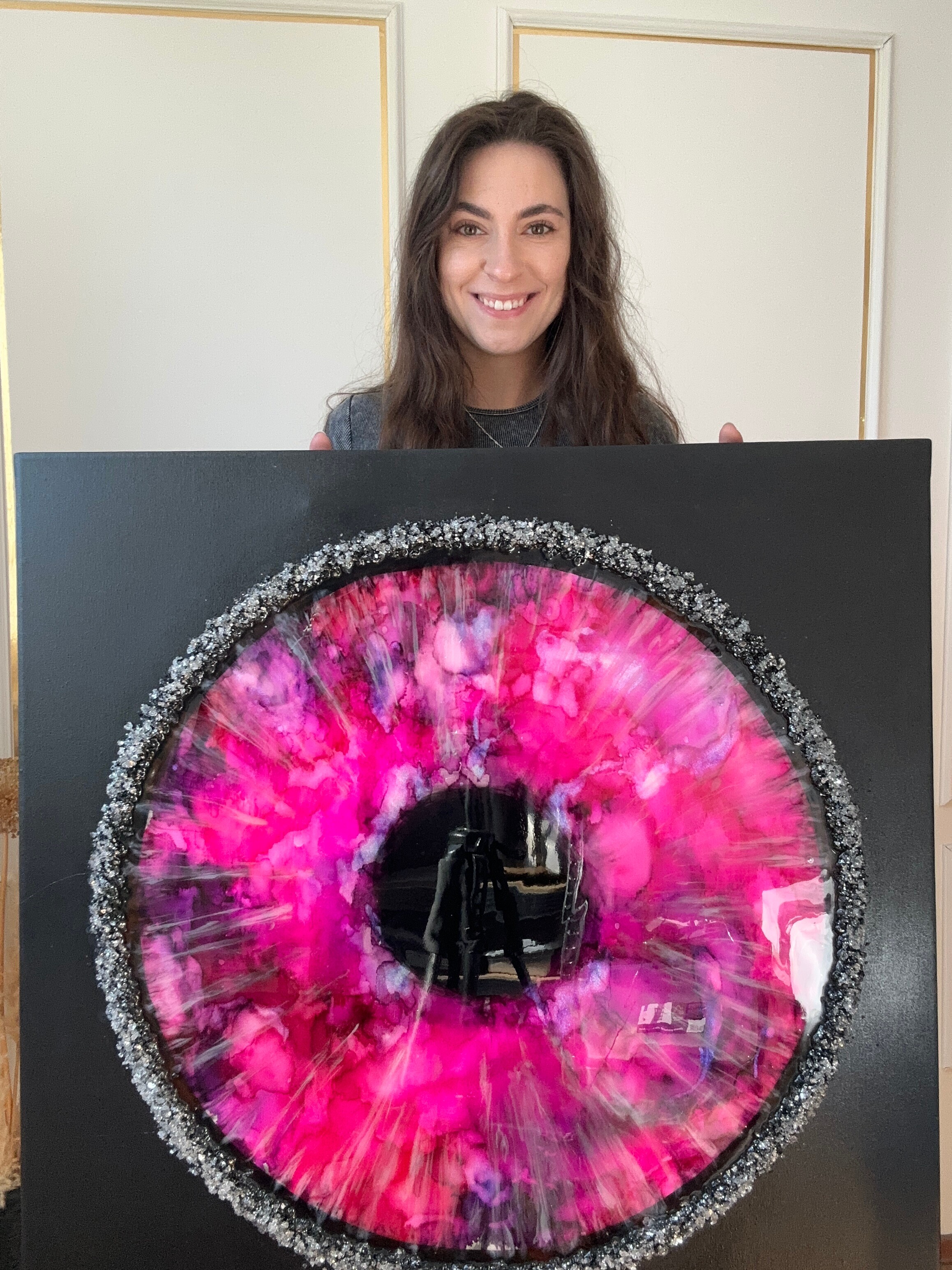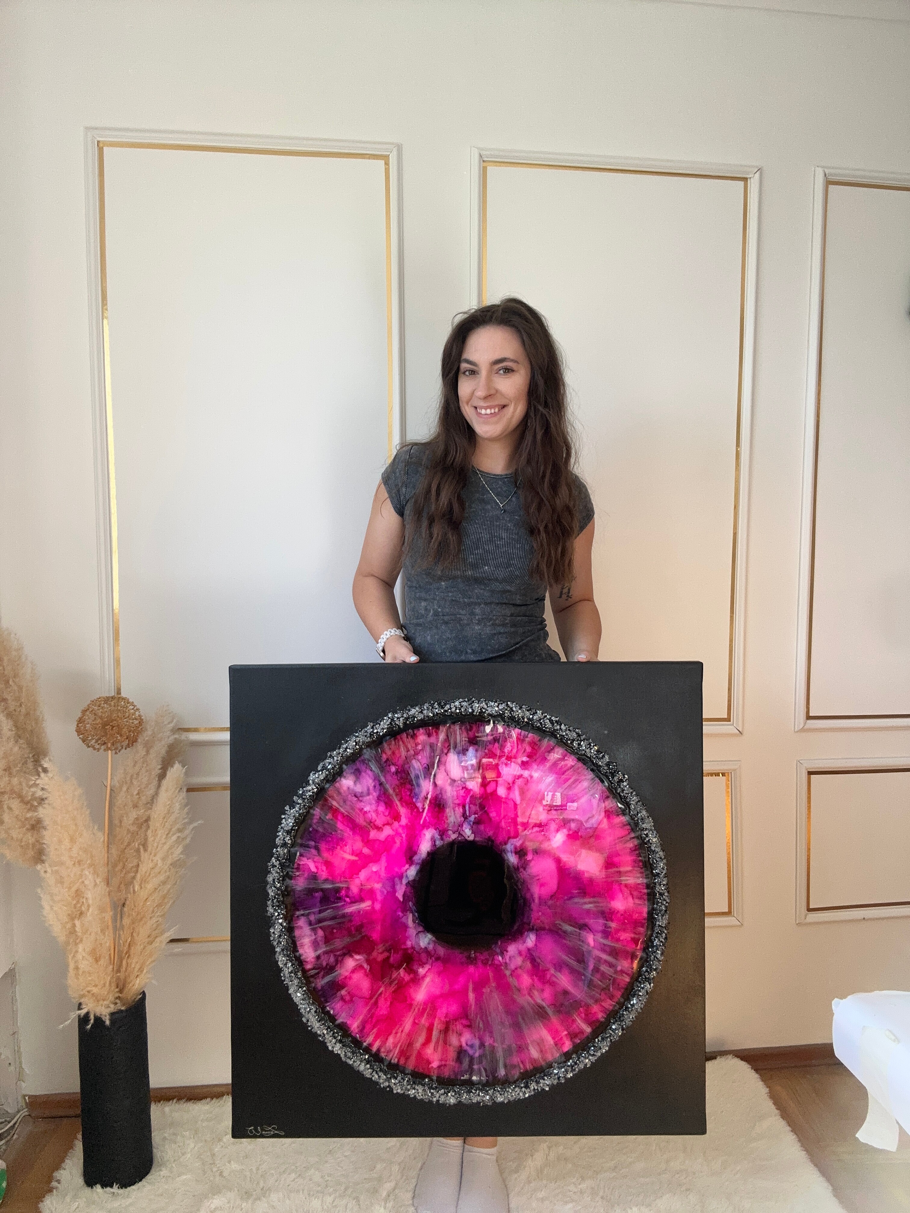 Obraz wykonany z żywicy epoksydowej, malowany farbami akrylowymi i tuszami alkoholowymi. Efekt 3D wyłożone kruszonym szkłem.