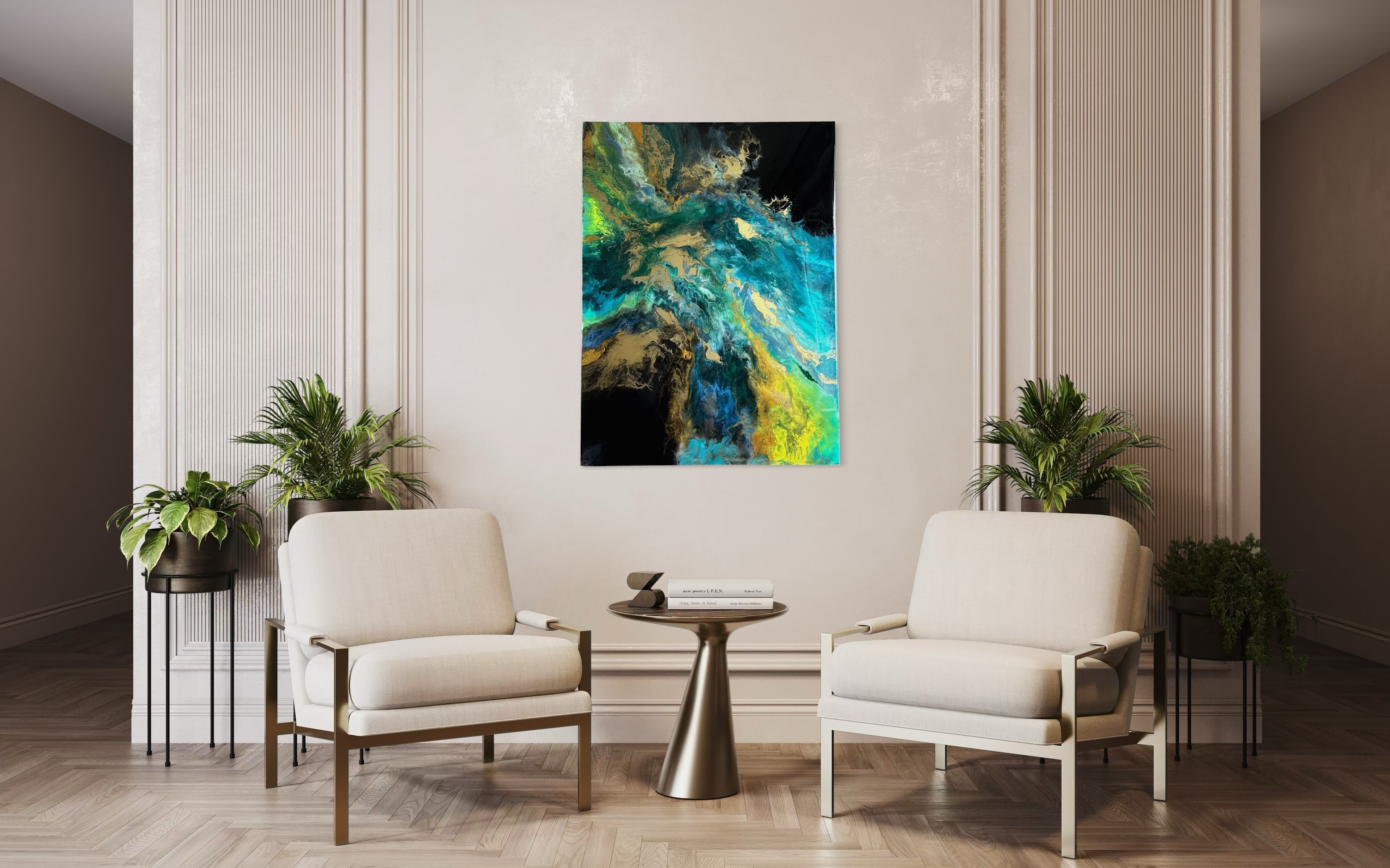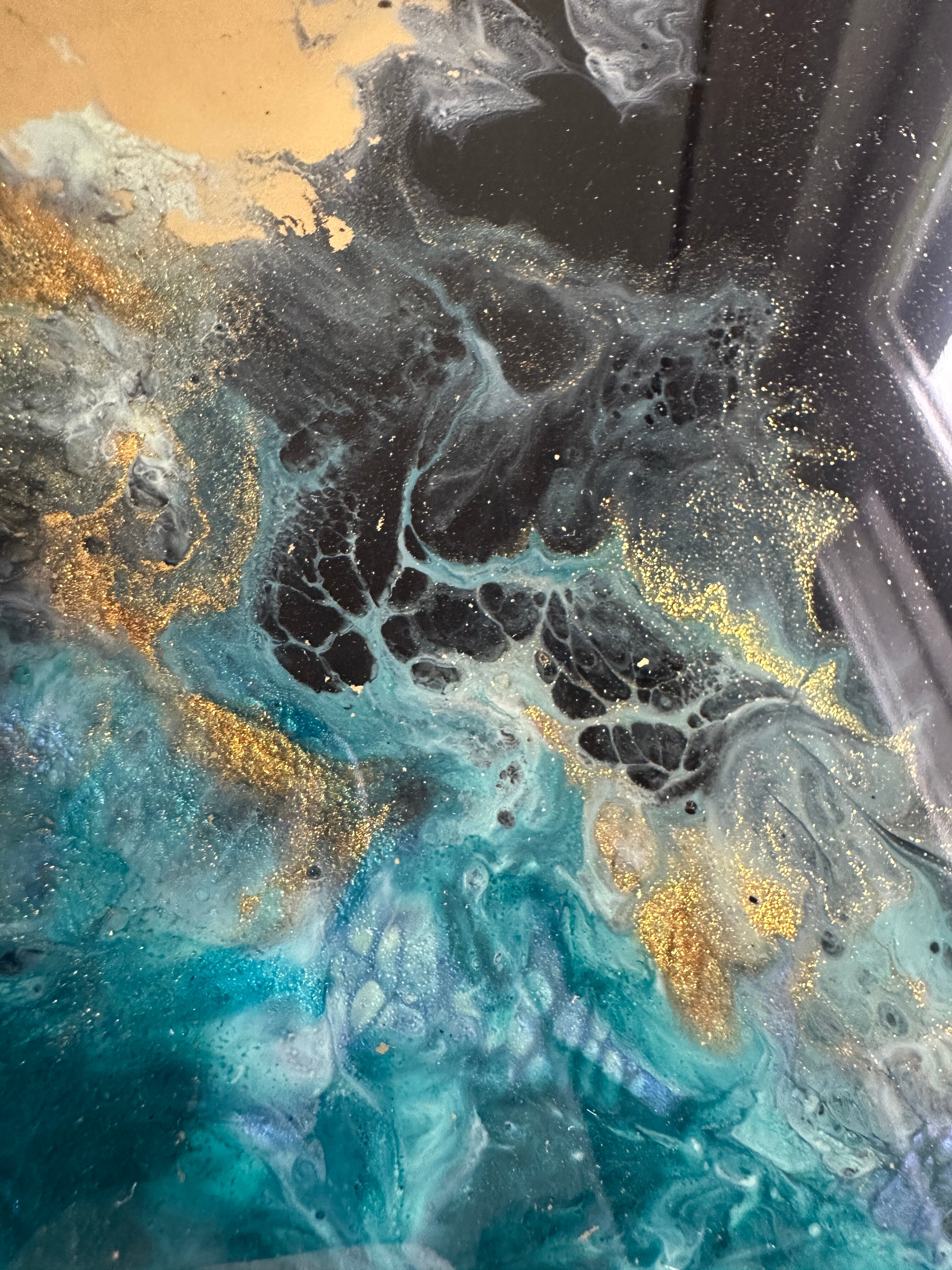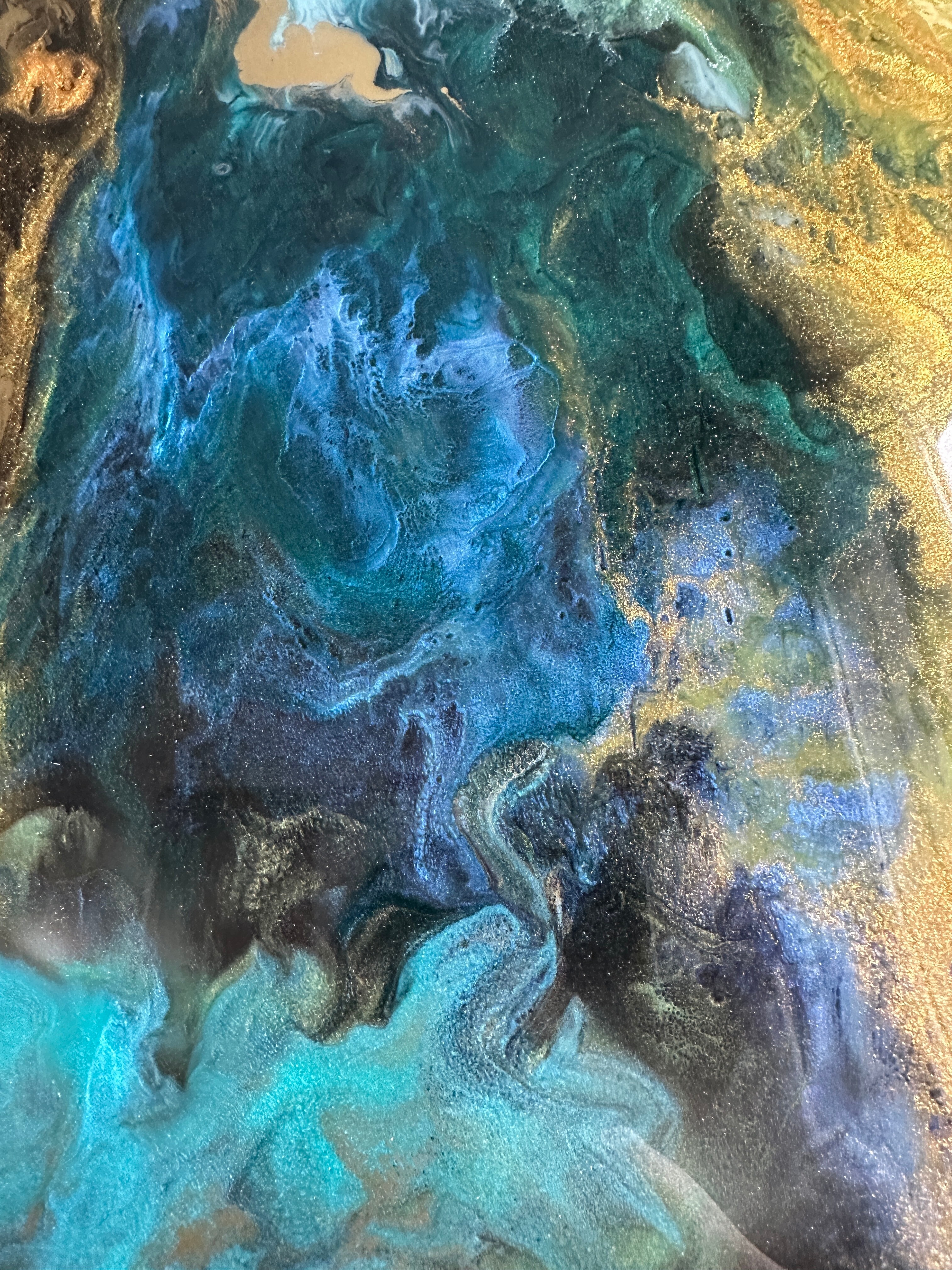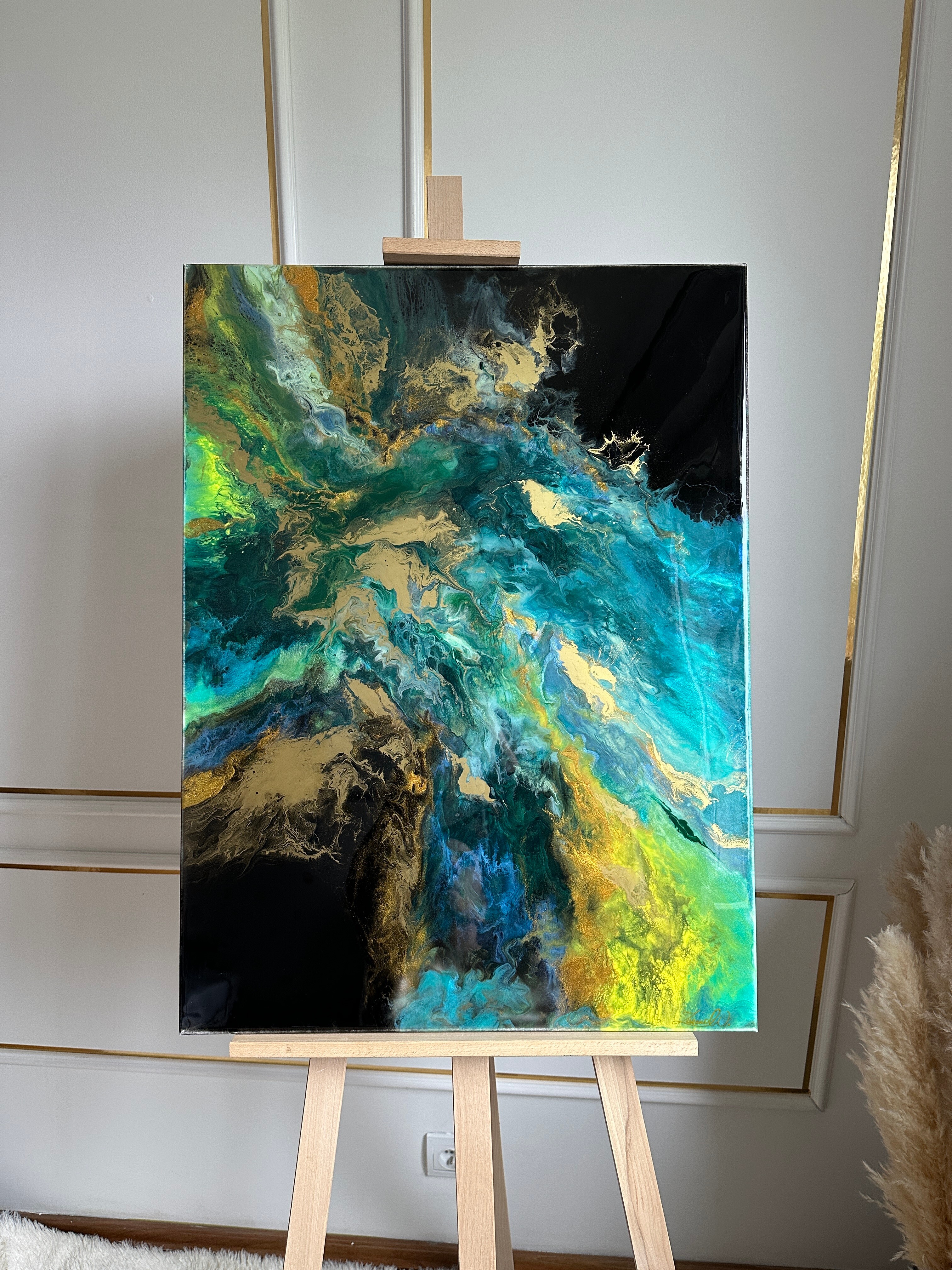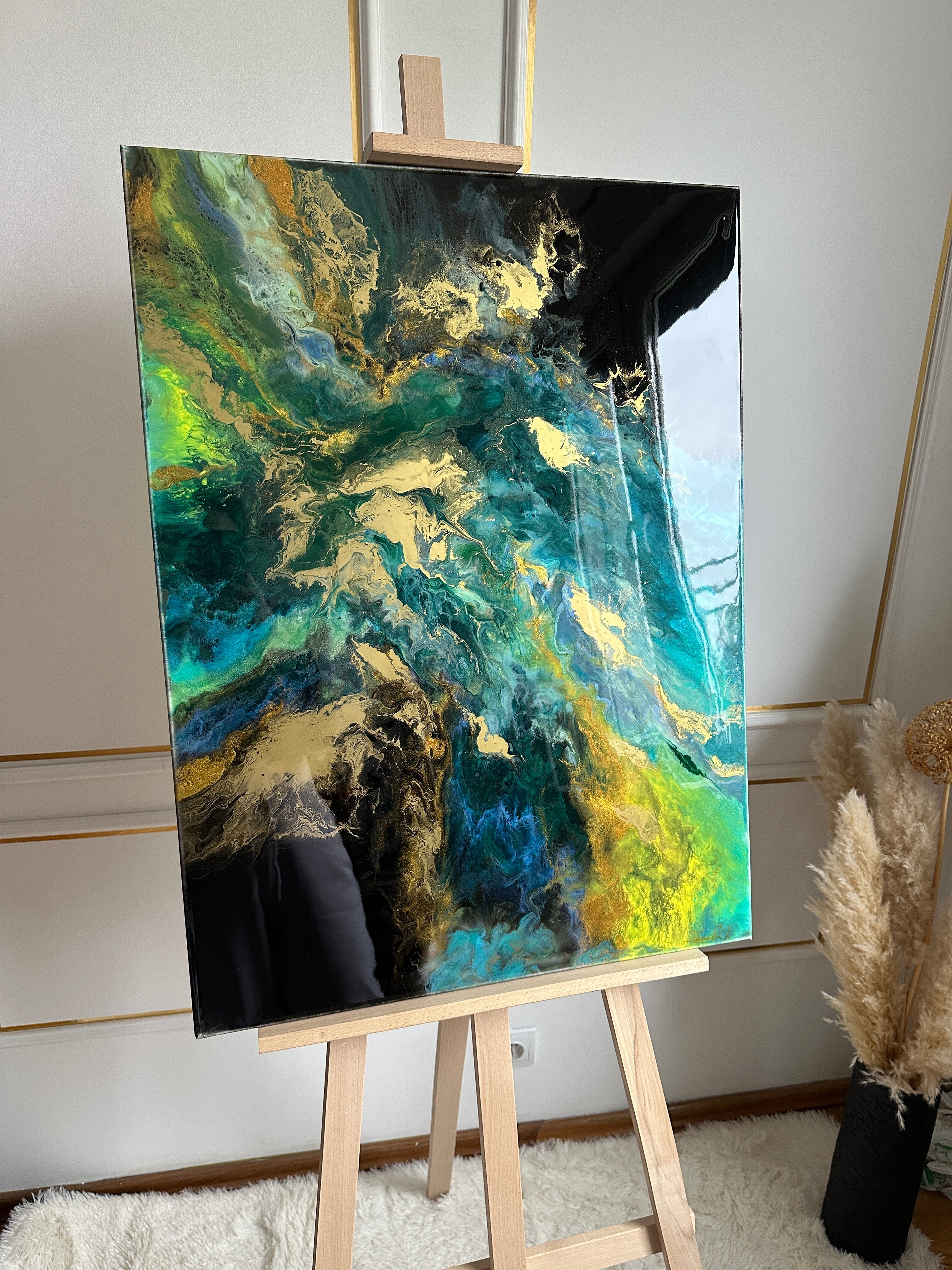 Obraz " Płynąca zieleń" malowany żywicą epoksydową z metalicznym złotem.
