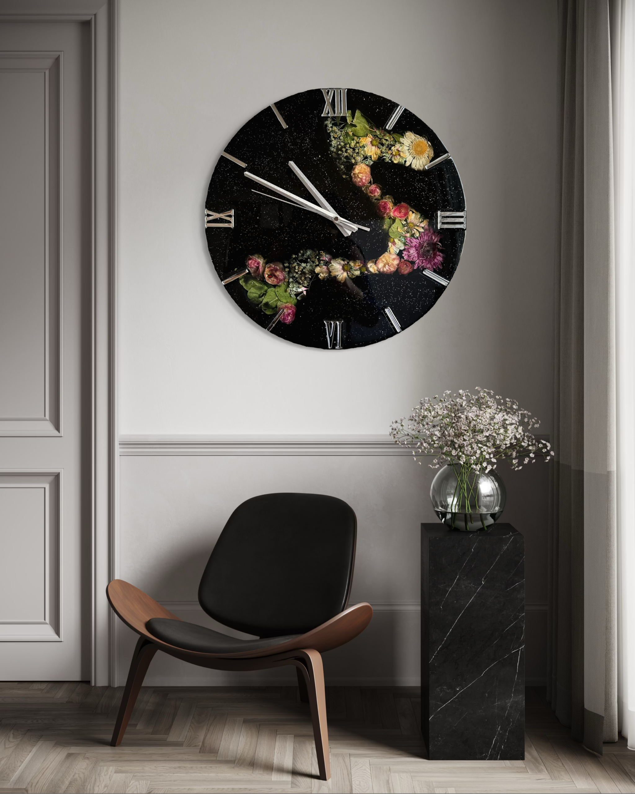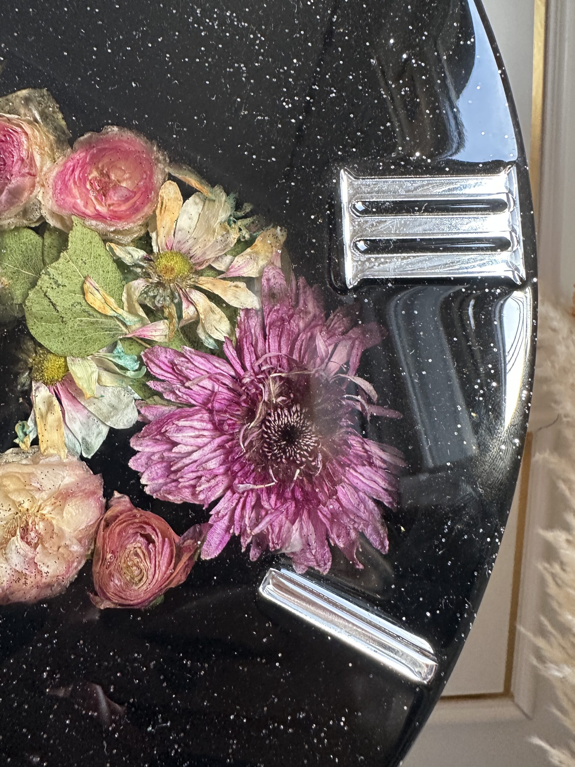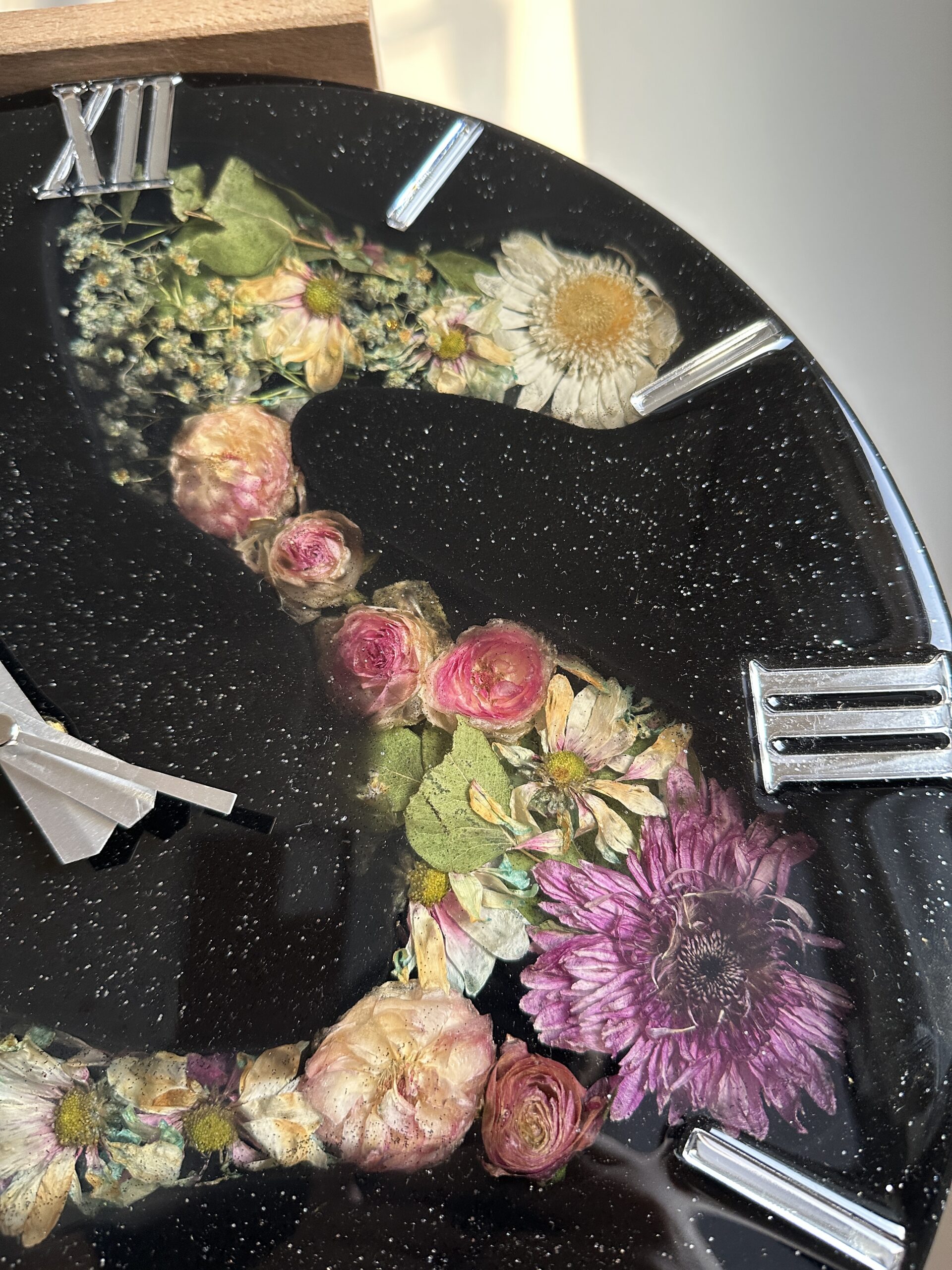 Zegar 40cm z żywicy epoksydowej - wypełniony suszonymi kwiatami. Cyfry rzymskie - efekt lustra w odcieniu srebra. Specyfikacja: ✨ Średnica : 40cm ✨ Posiada metalową zawieszkę ✨ Zabezpieczony żywicą odporną na żółknięcie i mikro zarysowania. ✨ Certyfikat autentyczności