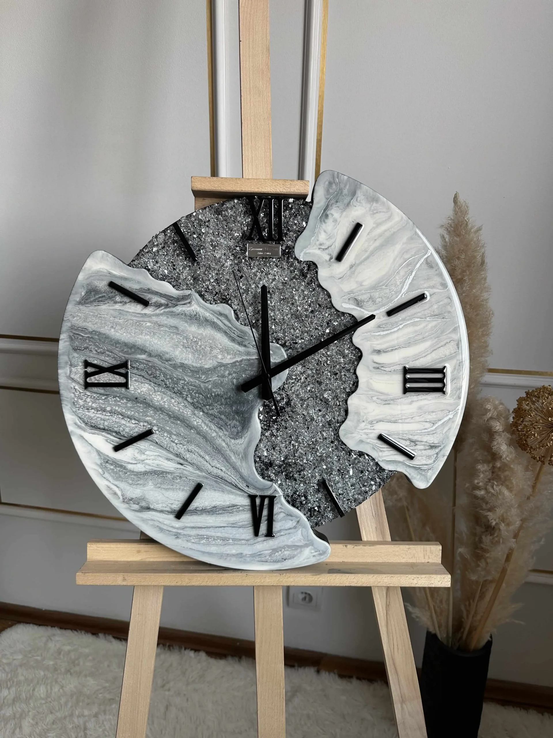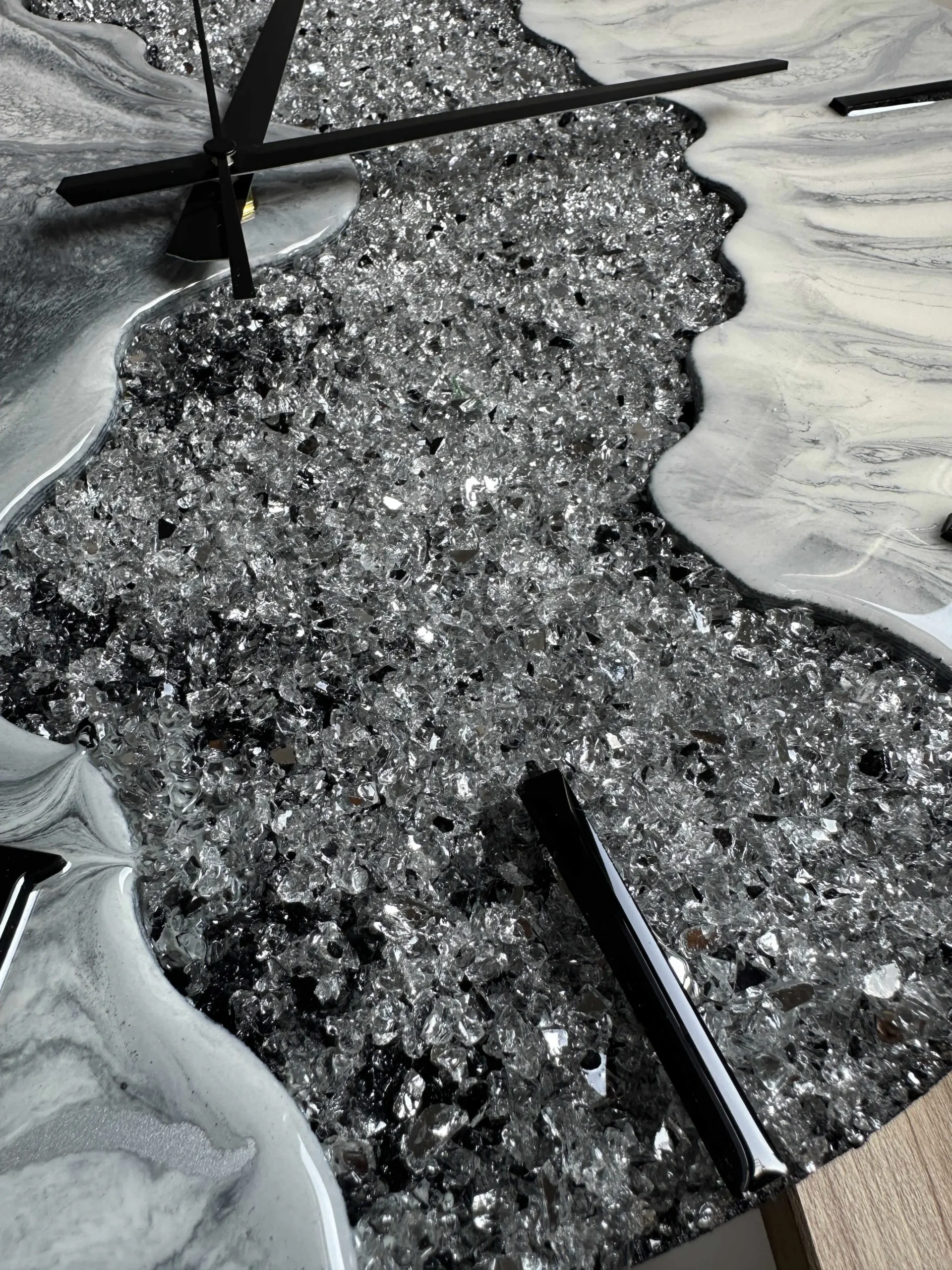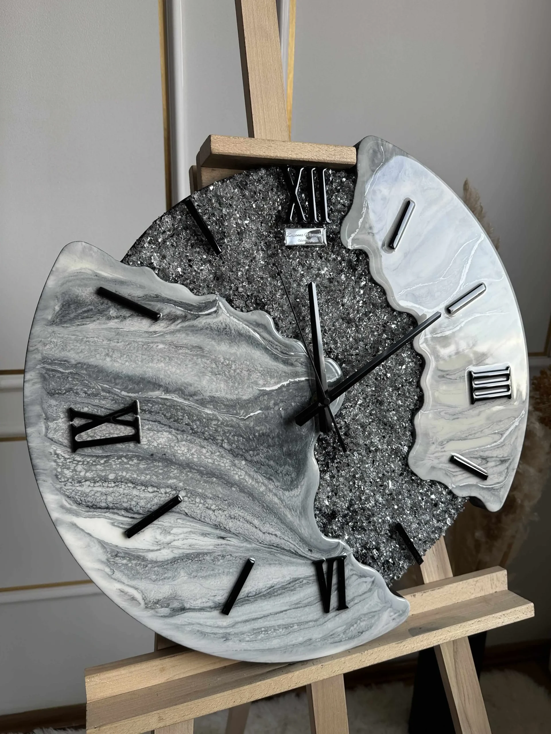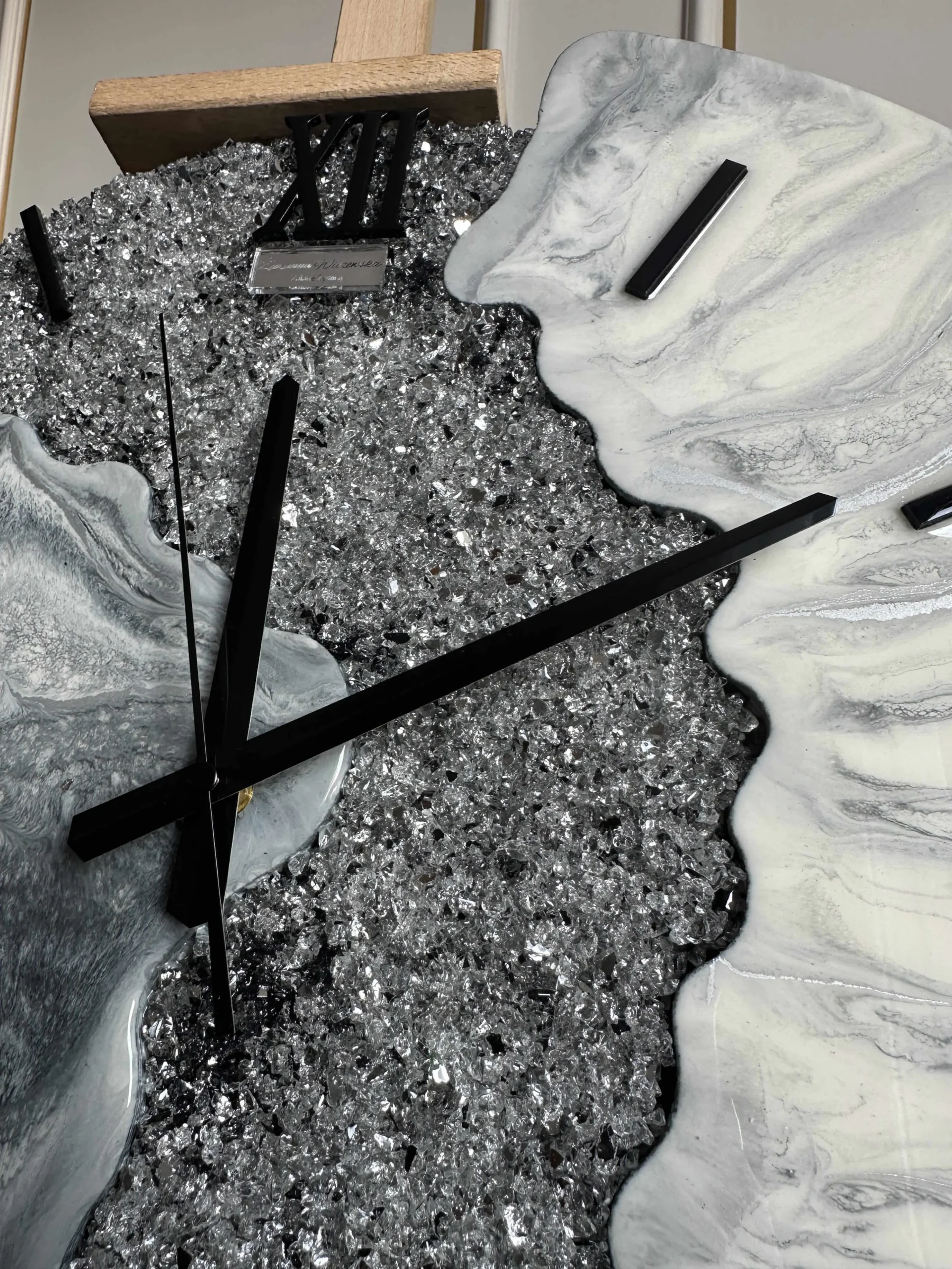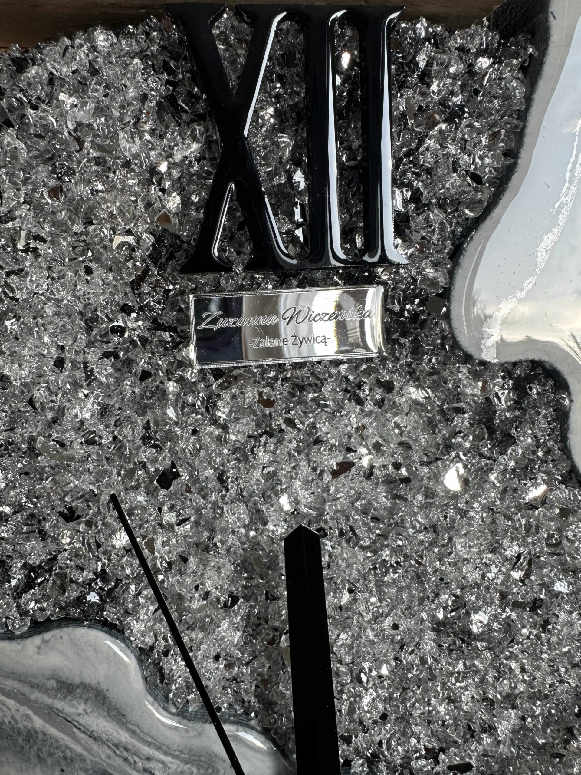 Zegar 50cm z żywicy epoksydowej - kształt nieregularnyWyróżnia się nieregularnym kształtem, a jednocześnie jego wnętrze w środku wypełnione jest bogato zdobionym kruszonym szkłem w kolorze srebrnym z efektem lustra.Specyfikacja:✨ Średnica : 50cm✨ Odcienie srebra, kruszone lustrzane szkło,✨ Cyfry rzymskie z lustrzanej plexi, wskazówki metalowe w kolorze czarnym✨ Zrobiony na płycie mdf przylegającej do ściany, z metalową zawieszką✨ Zabezpieczony żywicą odporną na żółknięcie i mikro zarysowania.✨ Certyfikat autentyczności