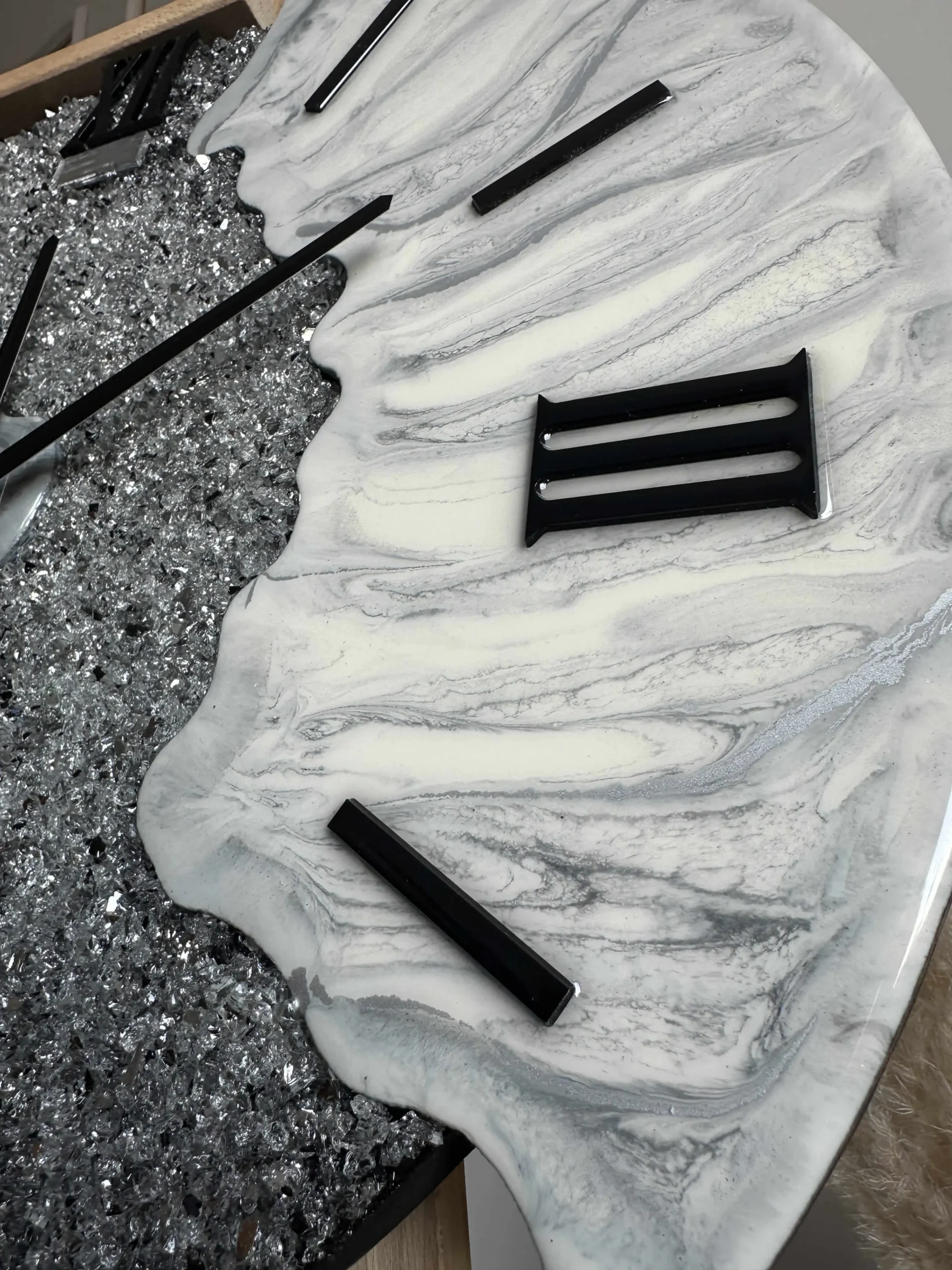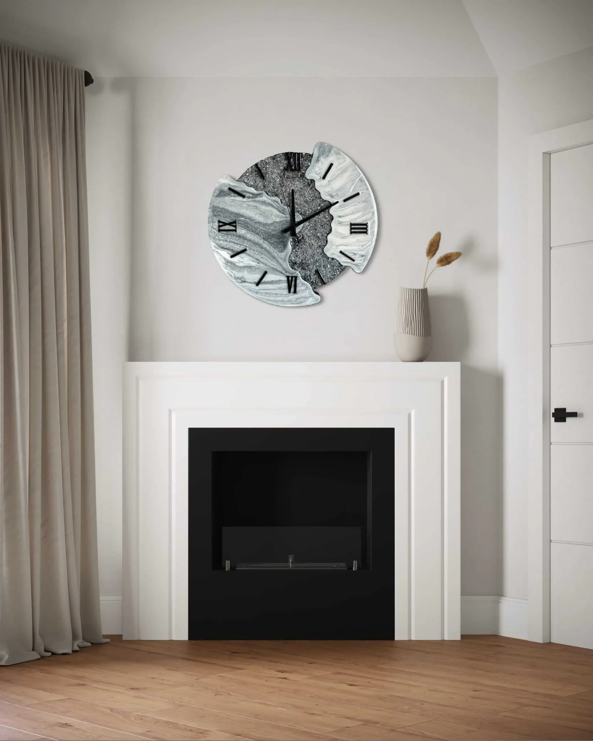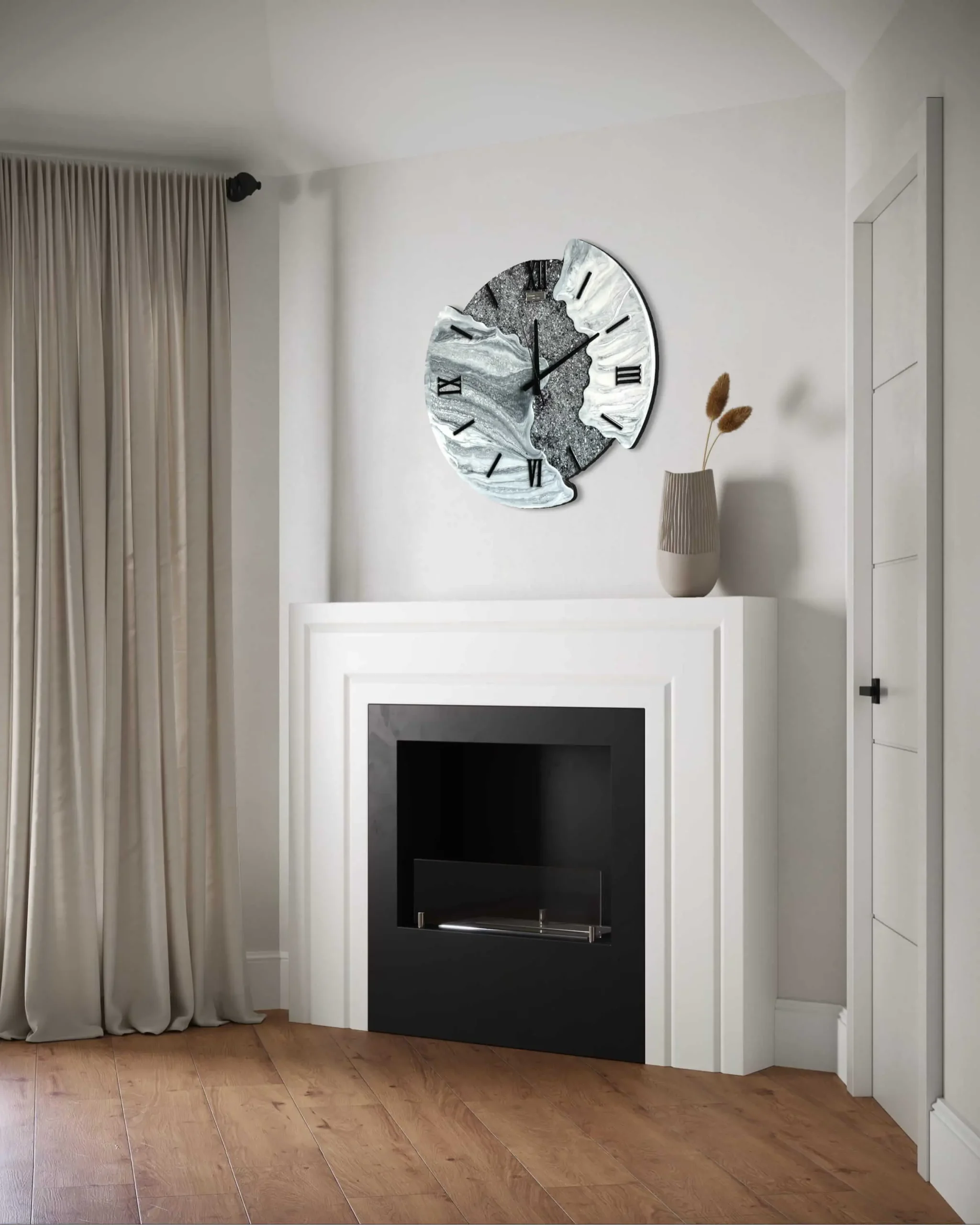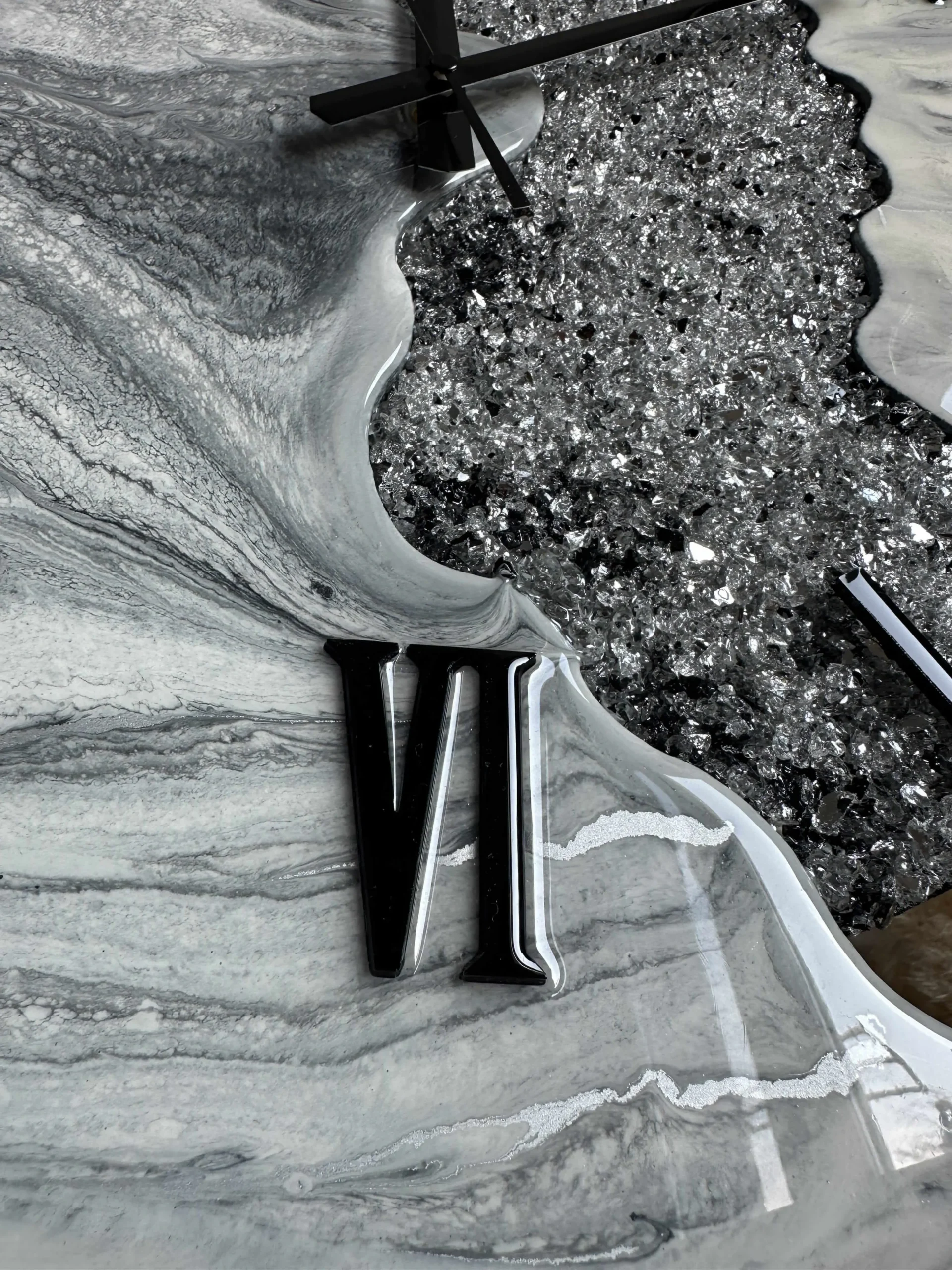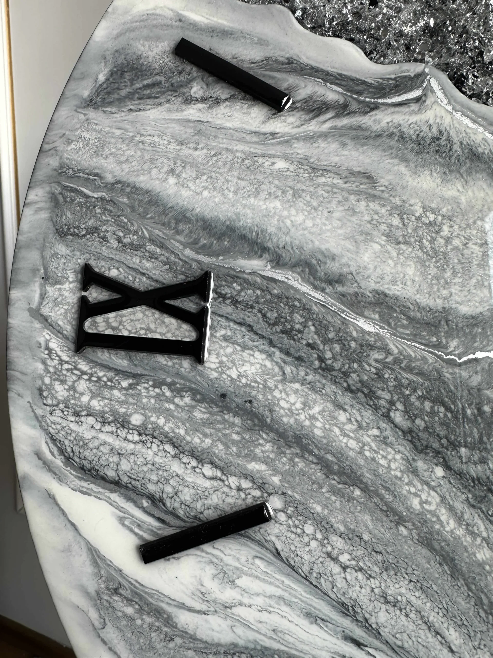 Zegar 50cm z żywicy epoksydowej - kształt nieregularnyWyróżnia się nieregularnym kształtem, a jednocześnie jego wnętrze w środku wypełnione jest bogato zdobionym kruszonym szkłem w kolorze srebrnym z efektem lustra.Specyfikacja:✨ Średnica : 50cm✨ Odcienie srebra, kruszone lustrzane szkło,✨ Cyfry rzymskie z lustrzanej plexi, wskazówki metalowe w kolorze czarnym✨ Zrobiony na płycie mdf przylegającej do ściany, z metalową zawieszką✨ Zabezpieczony żywicą odporną na żółknięcie i mikro zarysowania.✨ Certyfikat autentyczności