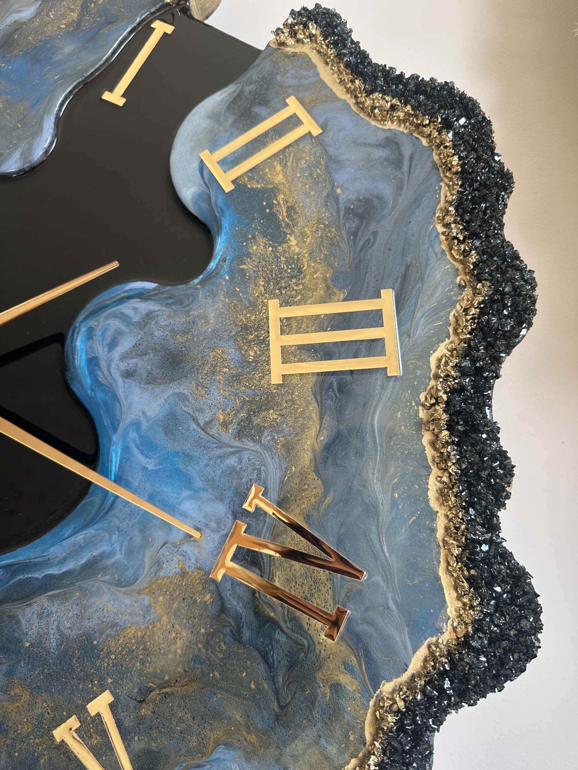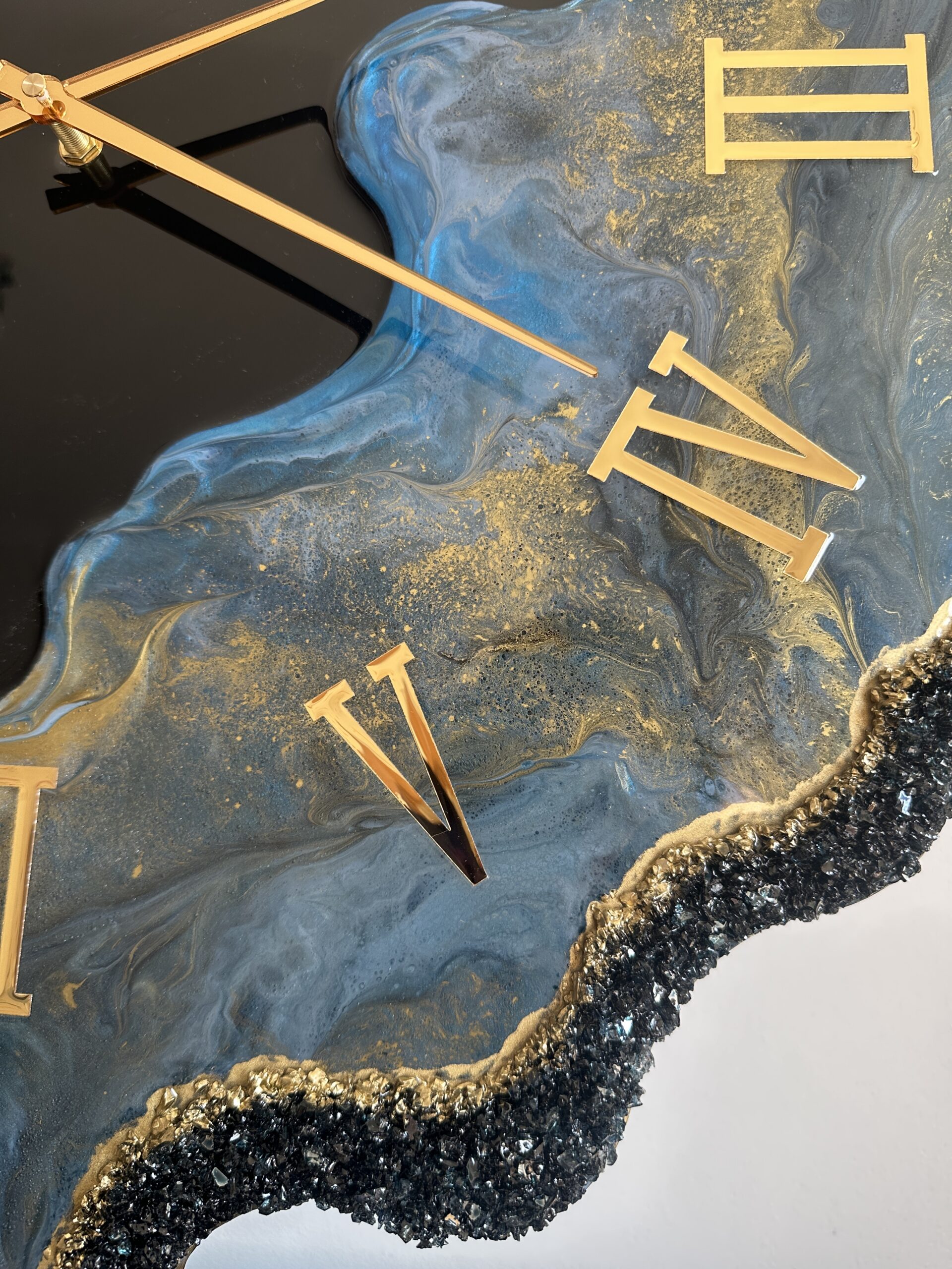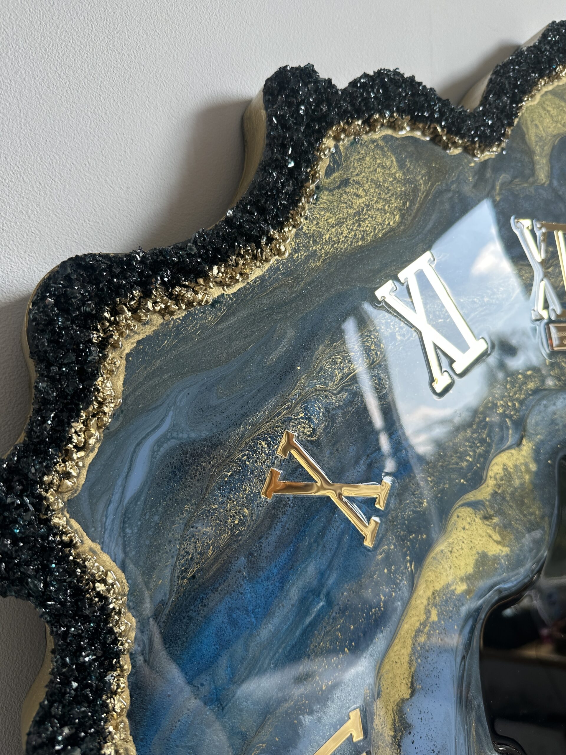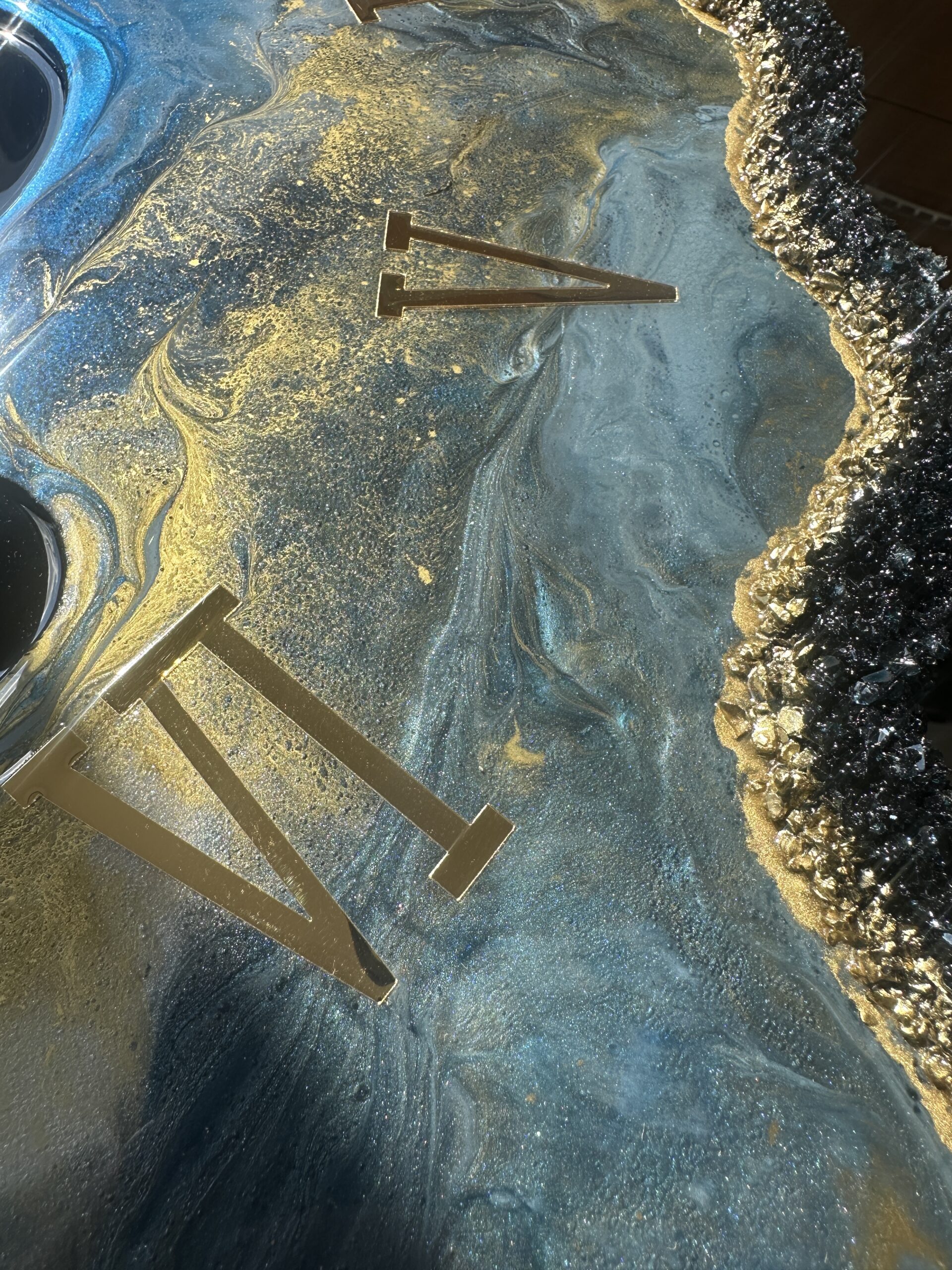 Zegar z żywicy epoksydowej z kruszonym szkłem, zdobiony złotem metalicznym na brzegach.Złote lustrzane cyfry i wskazówkiWymiary: 60x70 cm