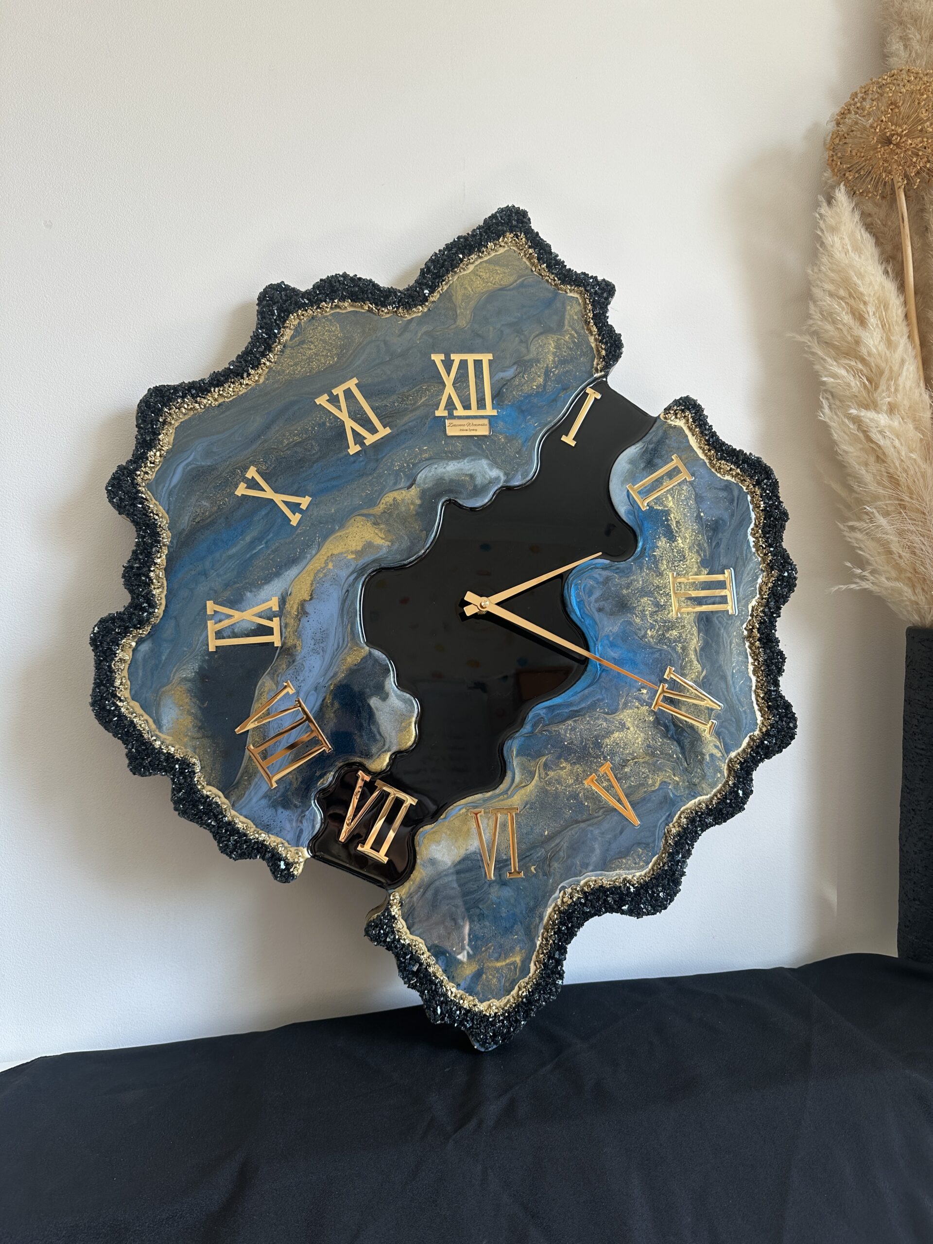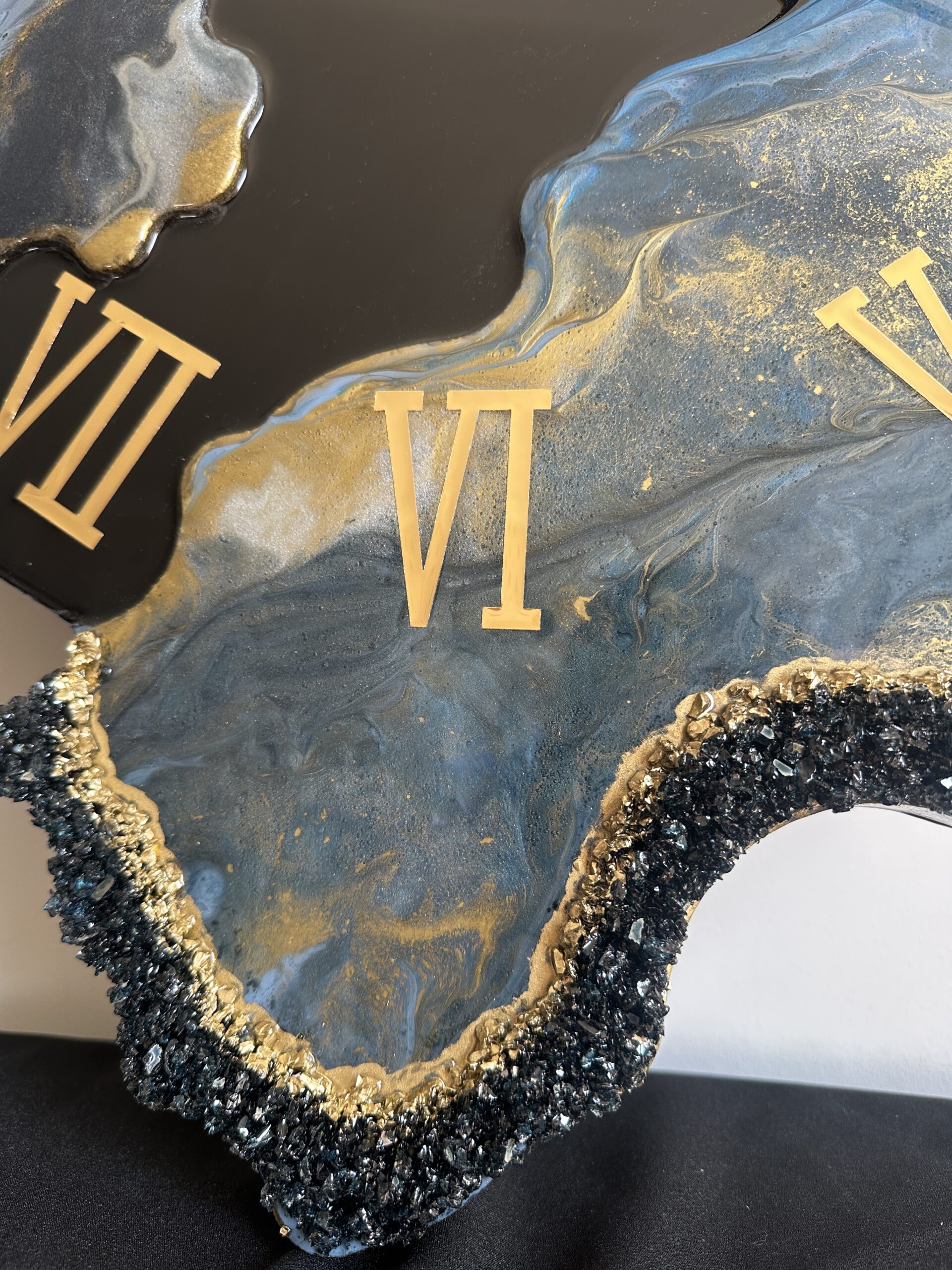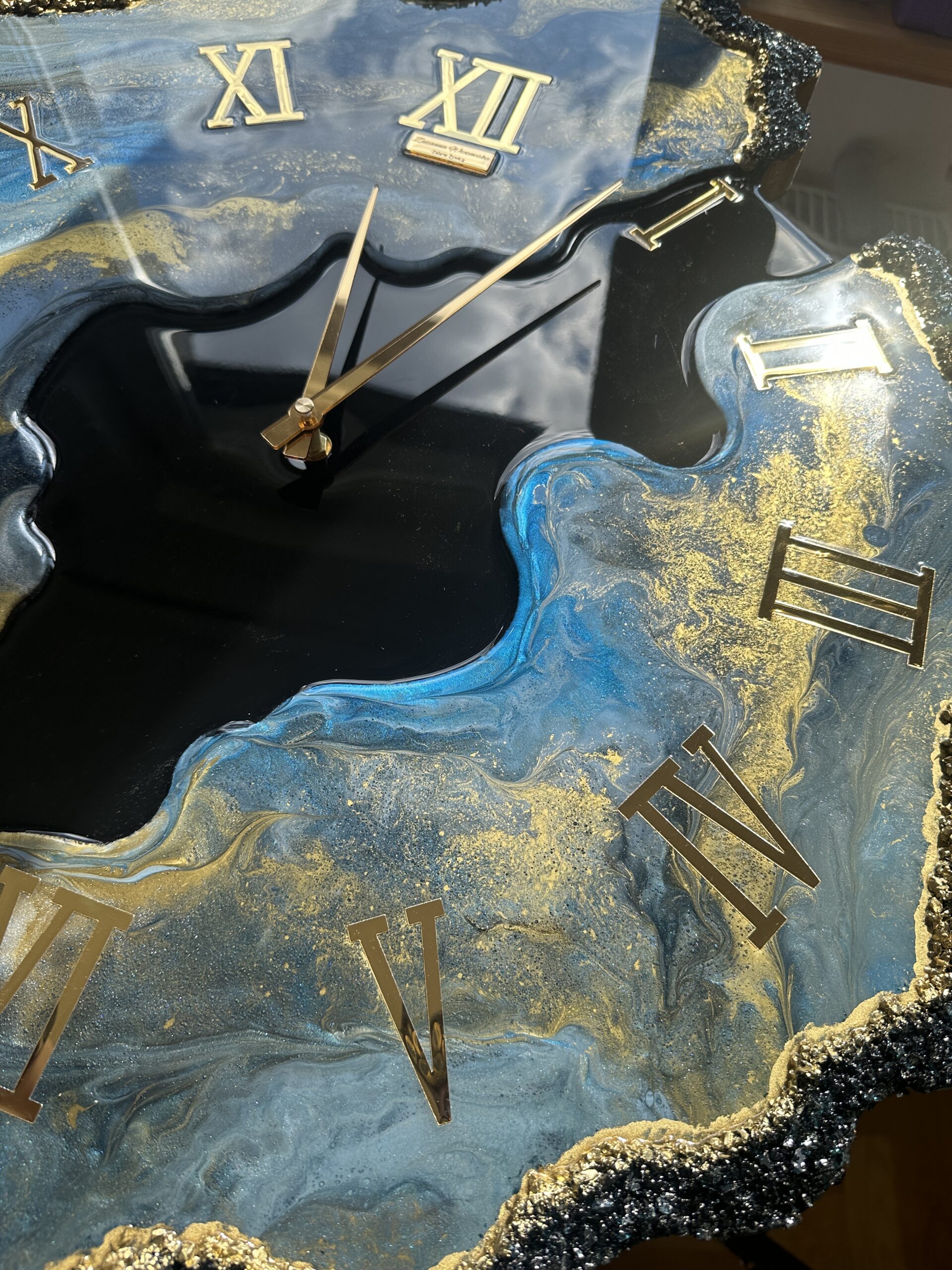 Zegar z żywicy epoksydowej z kruszonym szkłem, zdobiony złotem metalicznym na brzegach.Złote lustrzane cyfry i wskazówkiWymiary: 60x70 cm
