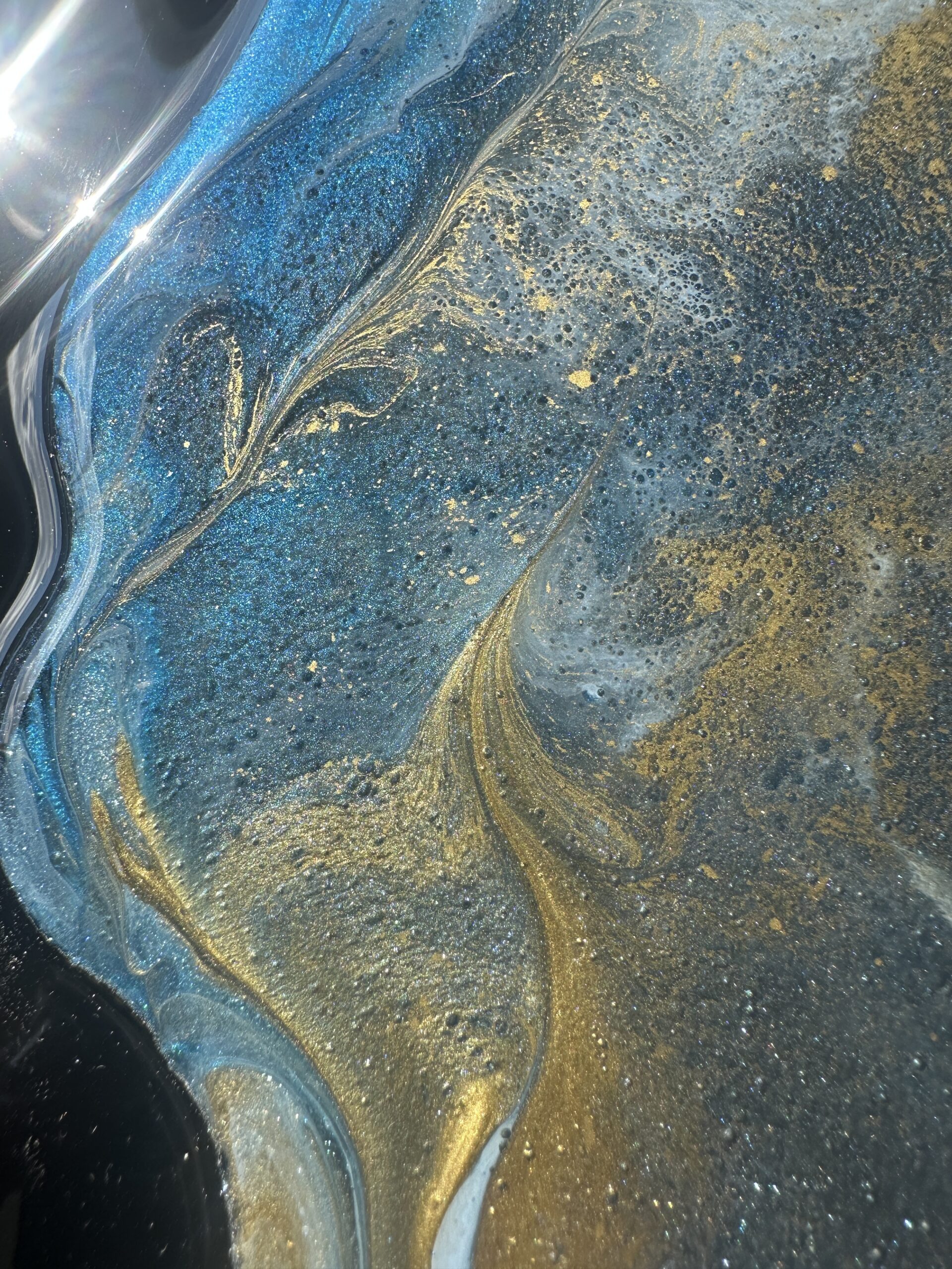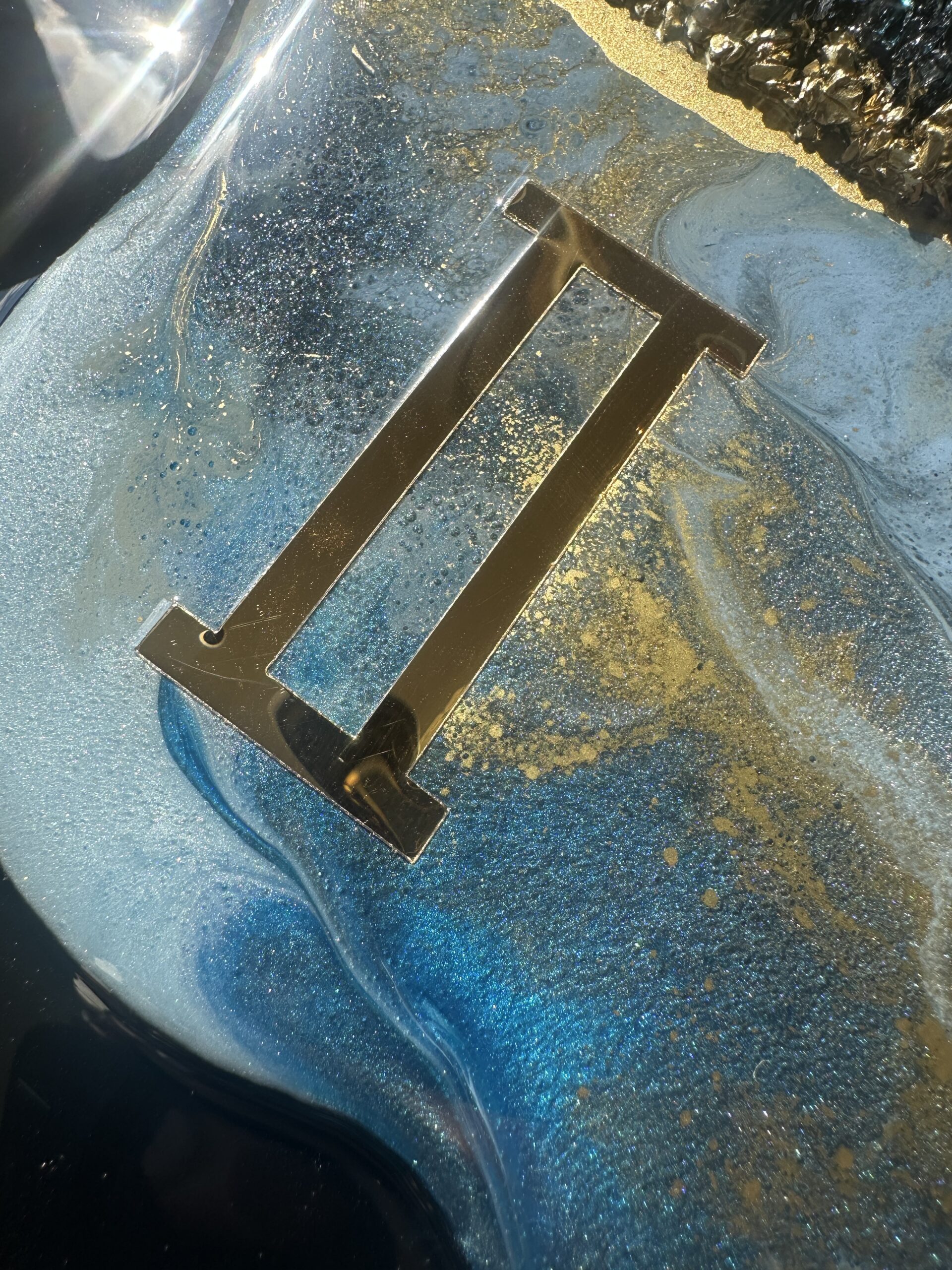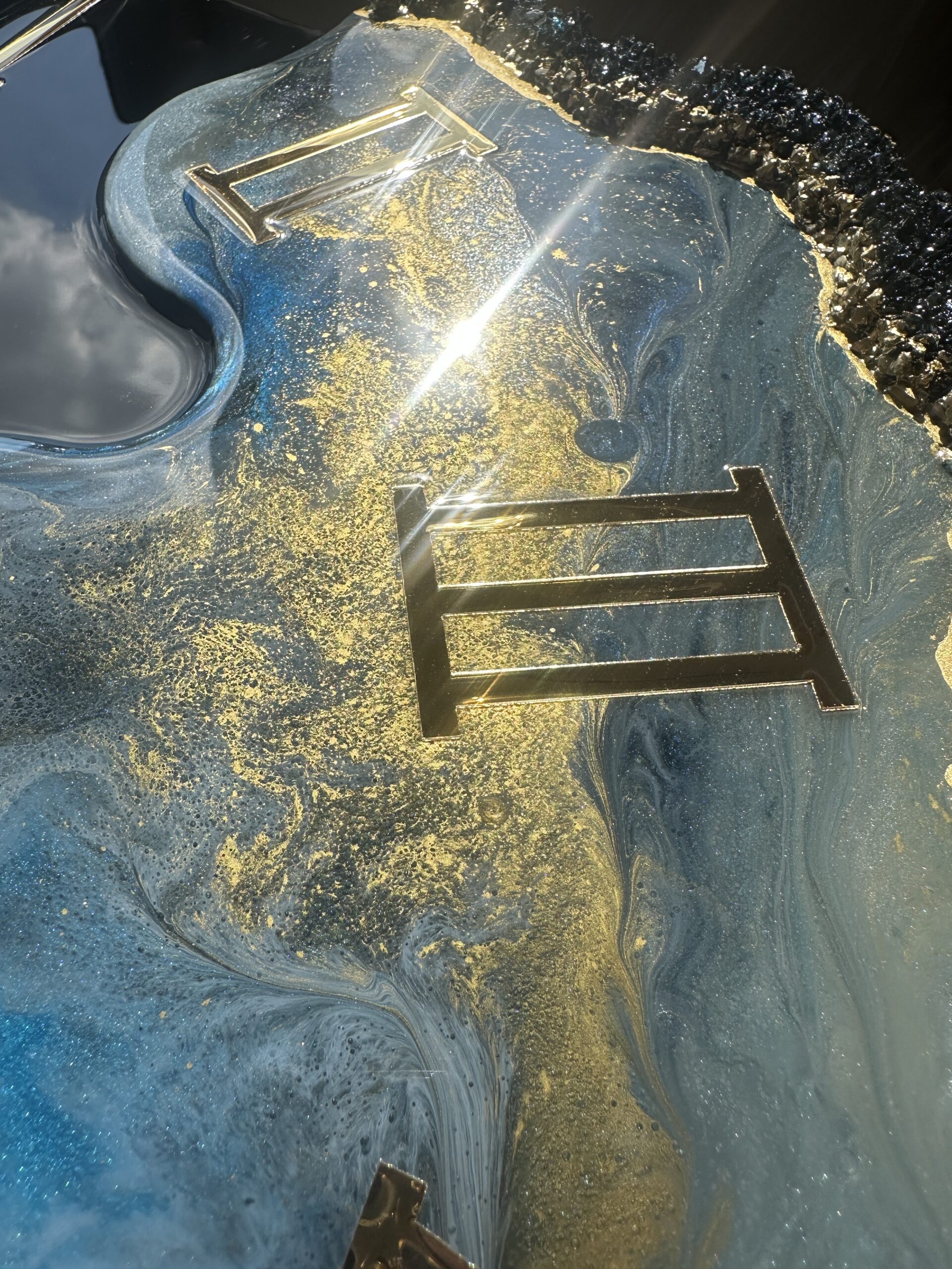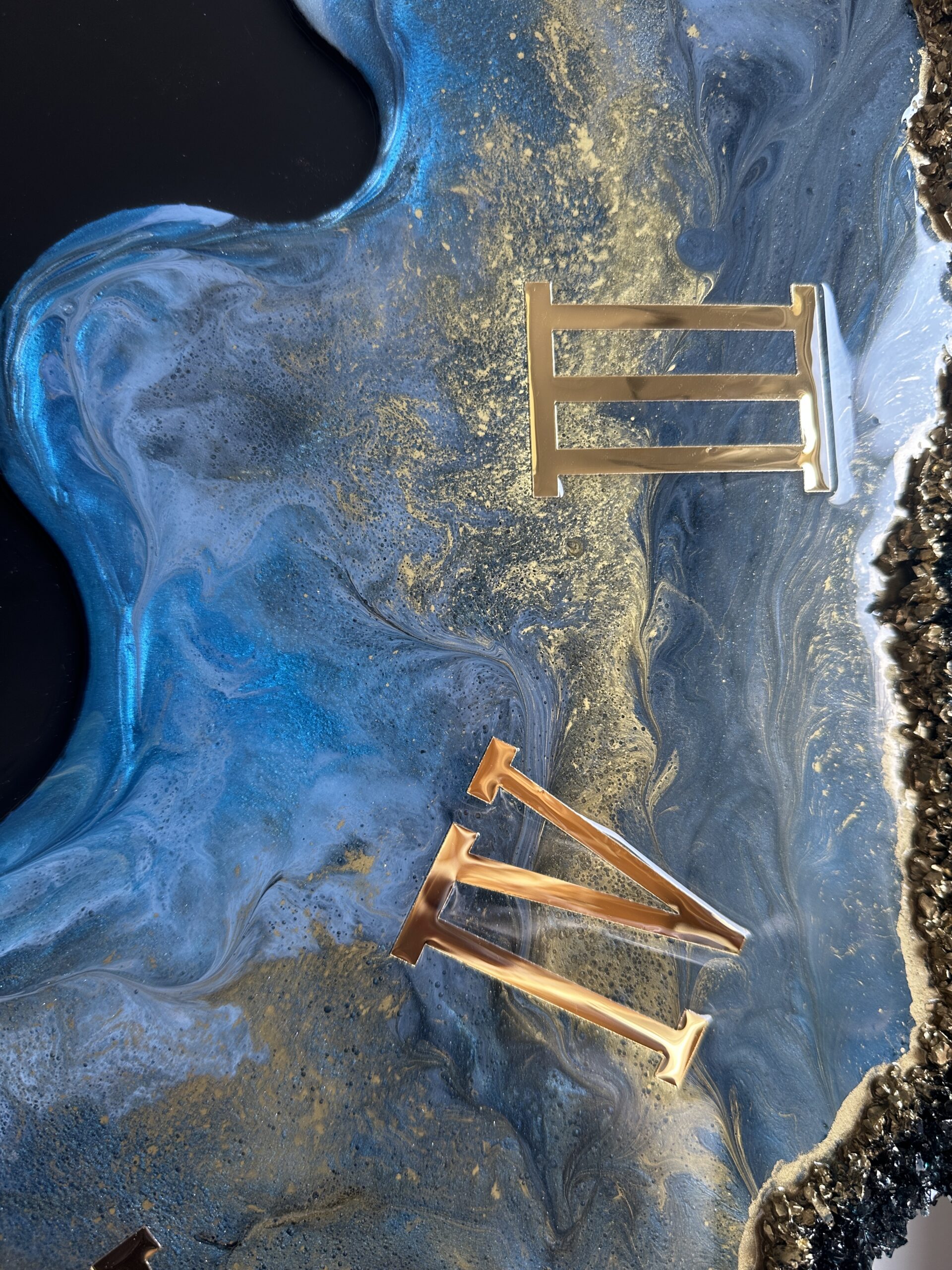 Zegar z żywicy epoksydowej z kruszonym szkłem, zdobiony złotem metalicznym na brzegach.Złote lustrzane cyfry i wskazówkiWymiary: 60x70 cm
