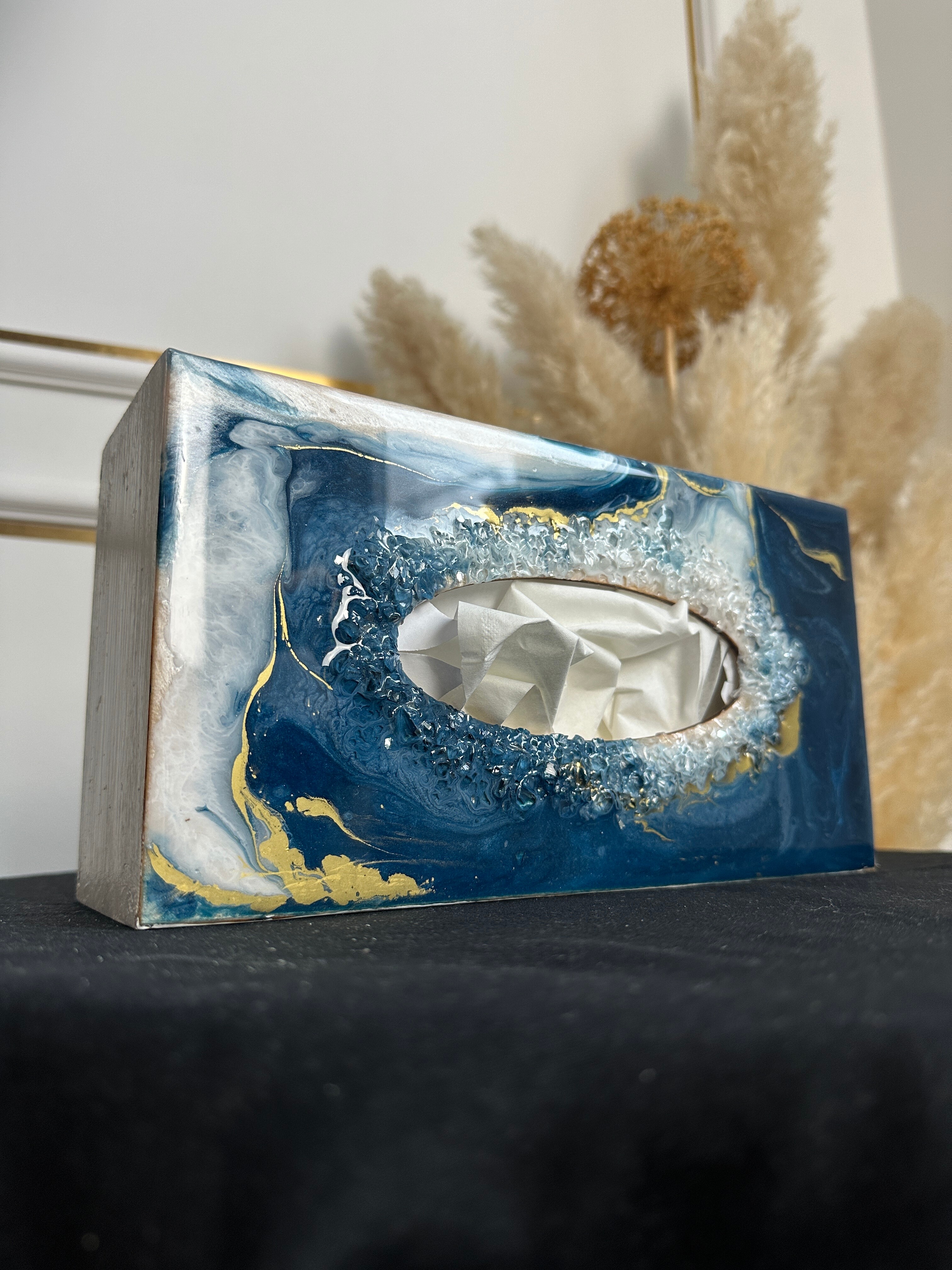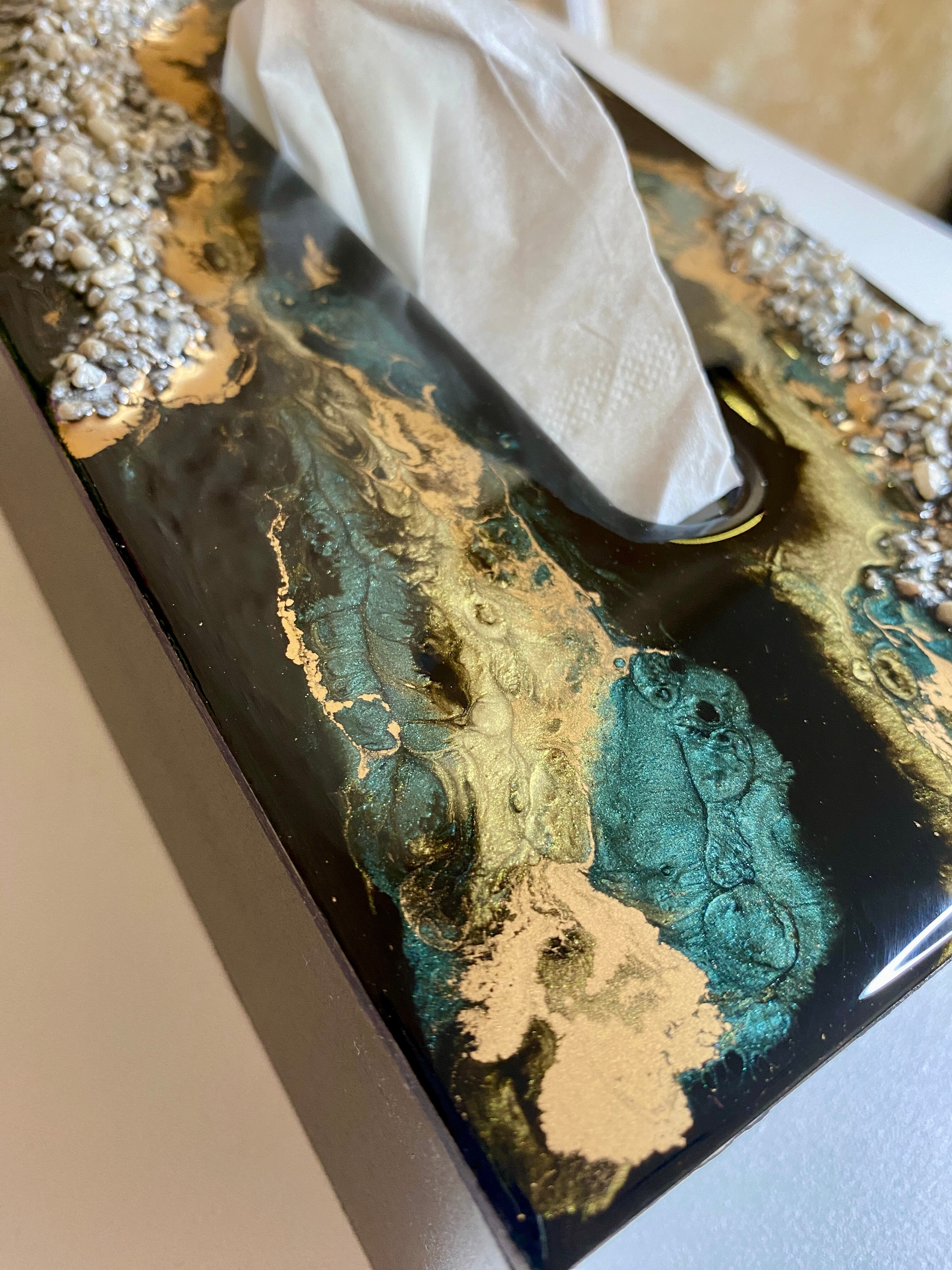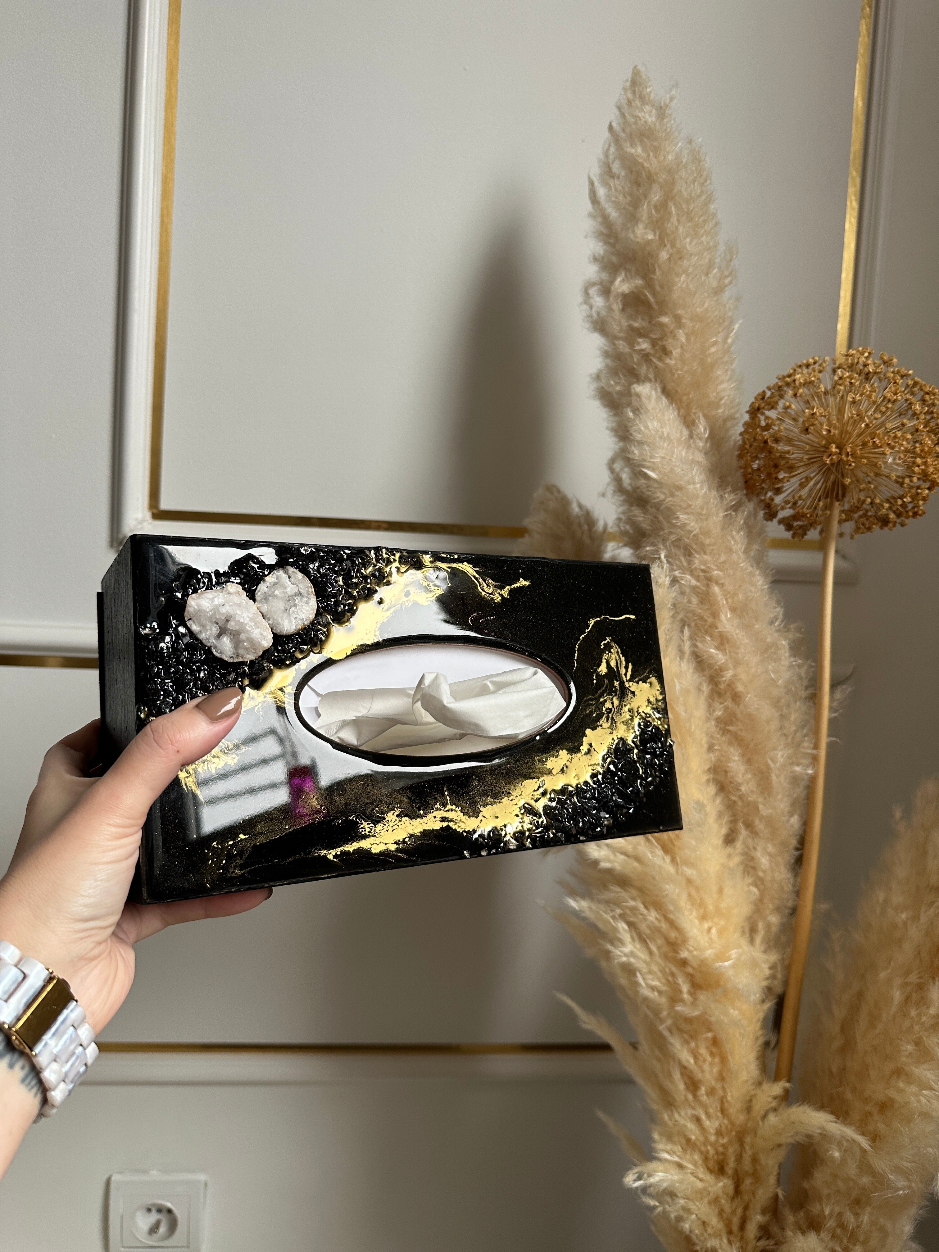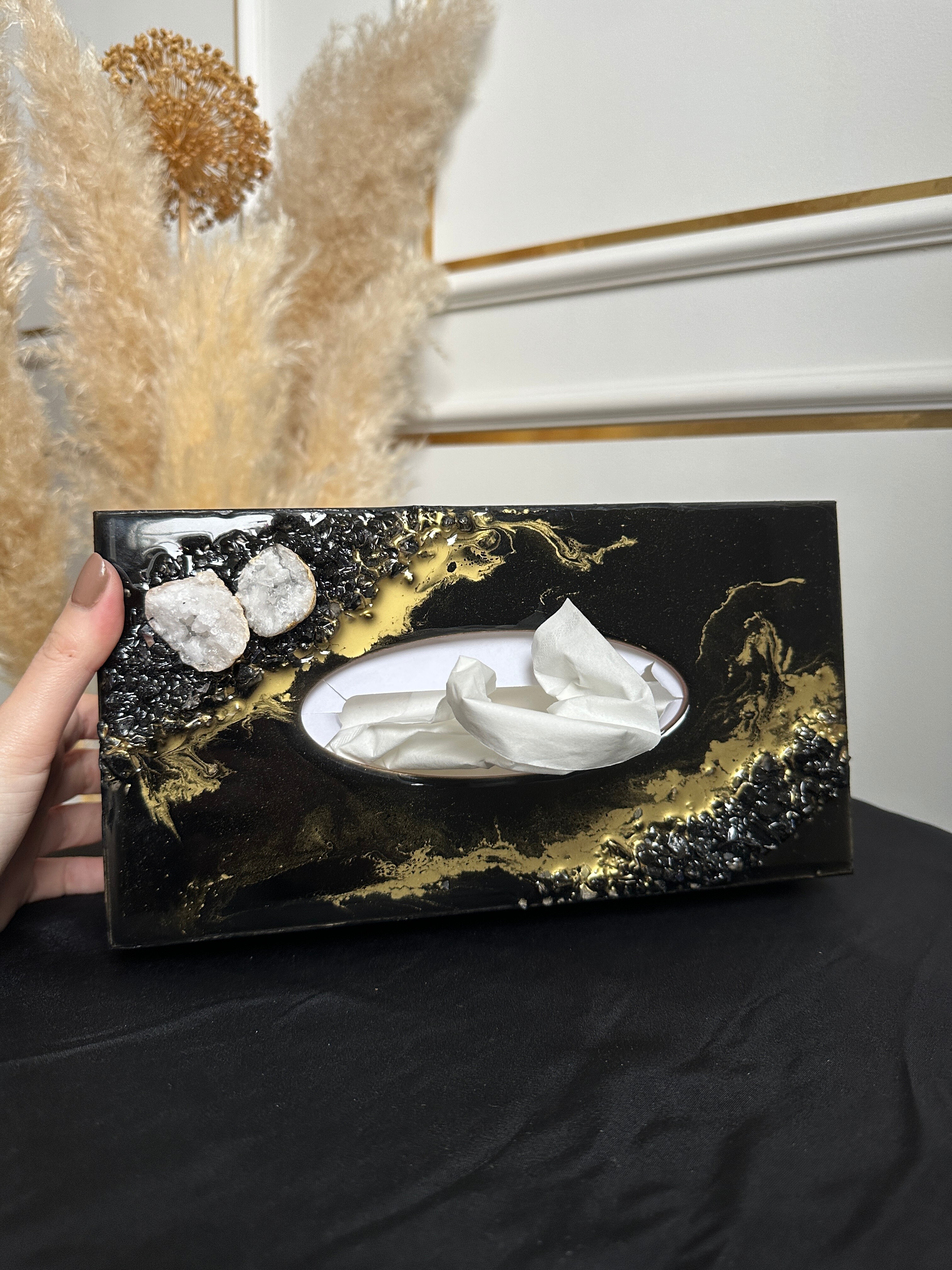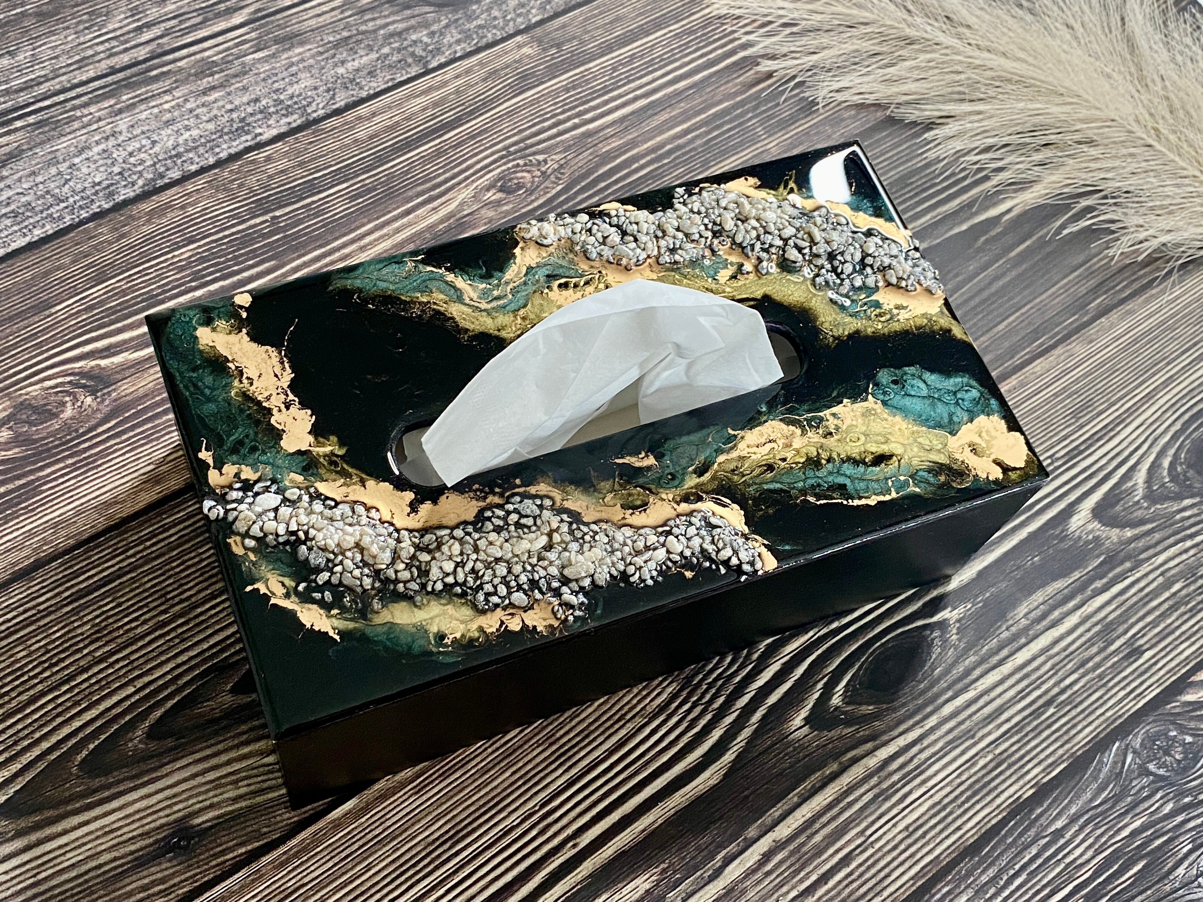 Ten niezwykły materiał, jakim jest połączenie szlachetnego drewna i krystalicznej żywicy, sprawia, że każdy egzemplarz jest absolutnie unikatowy. Całość została wykonana z najwyższą dbałość o detale. Ten produkt nadaje wnętrzu niepowtarzalnego charakteru, idealnie komponując się z wystrojem salonu czy sypialni. Nasze pojemniki na chusteczki wykonane są z pasją i precyzją, co widać w każdym detalu. Każdy egzemplarz został wykończony ręką rzemieślnika.