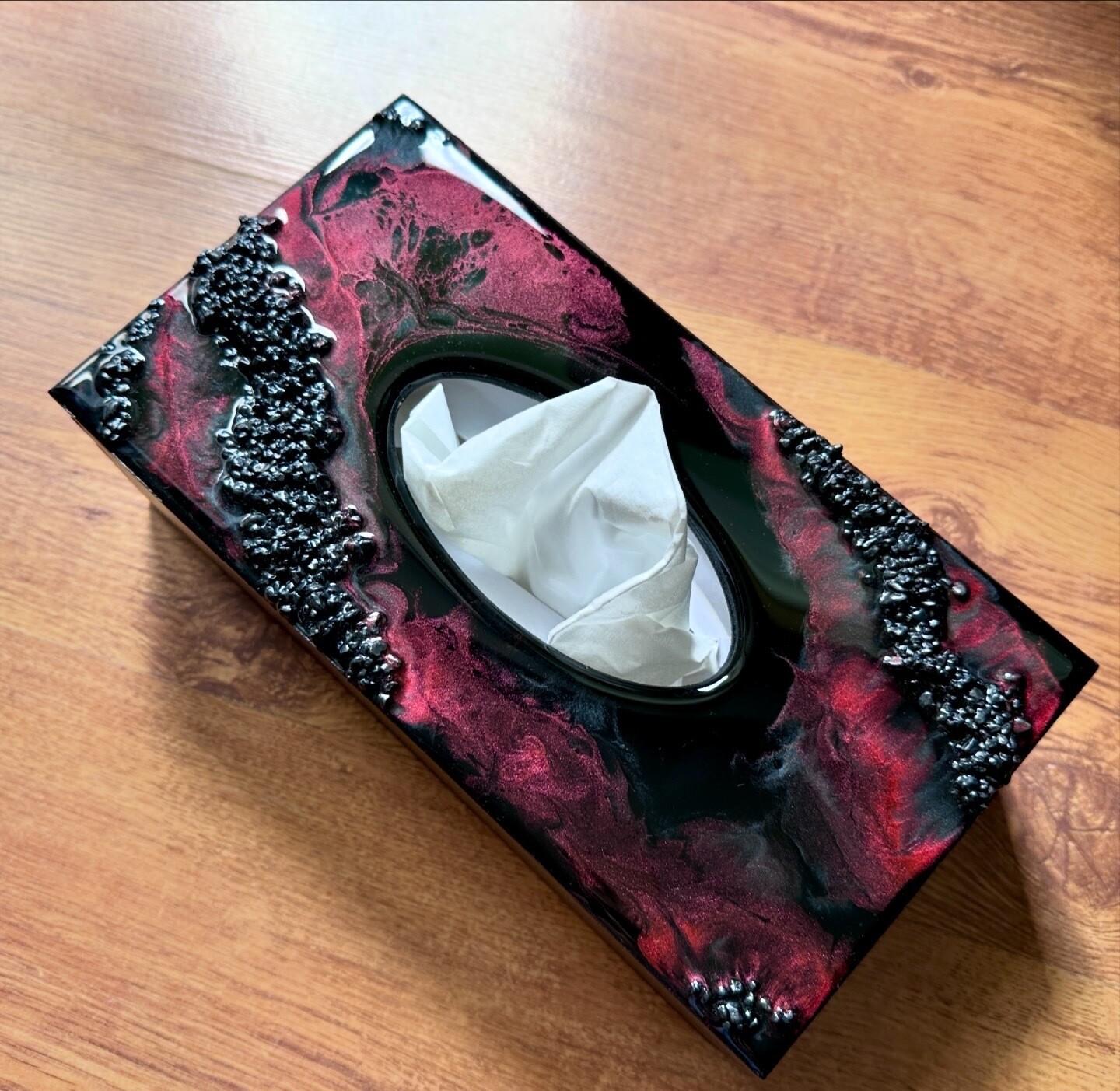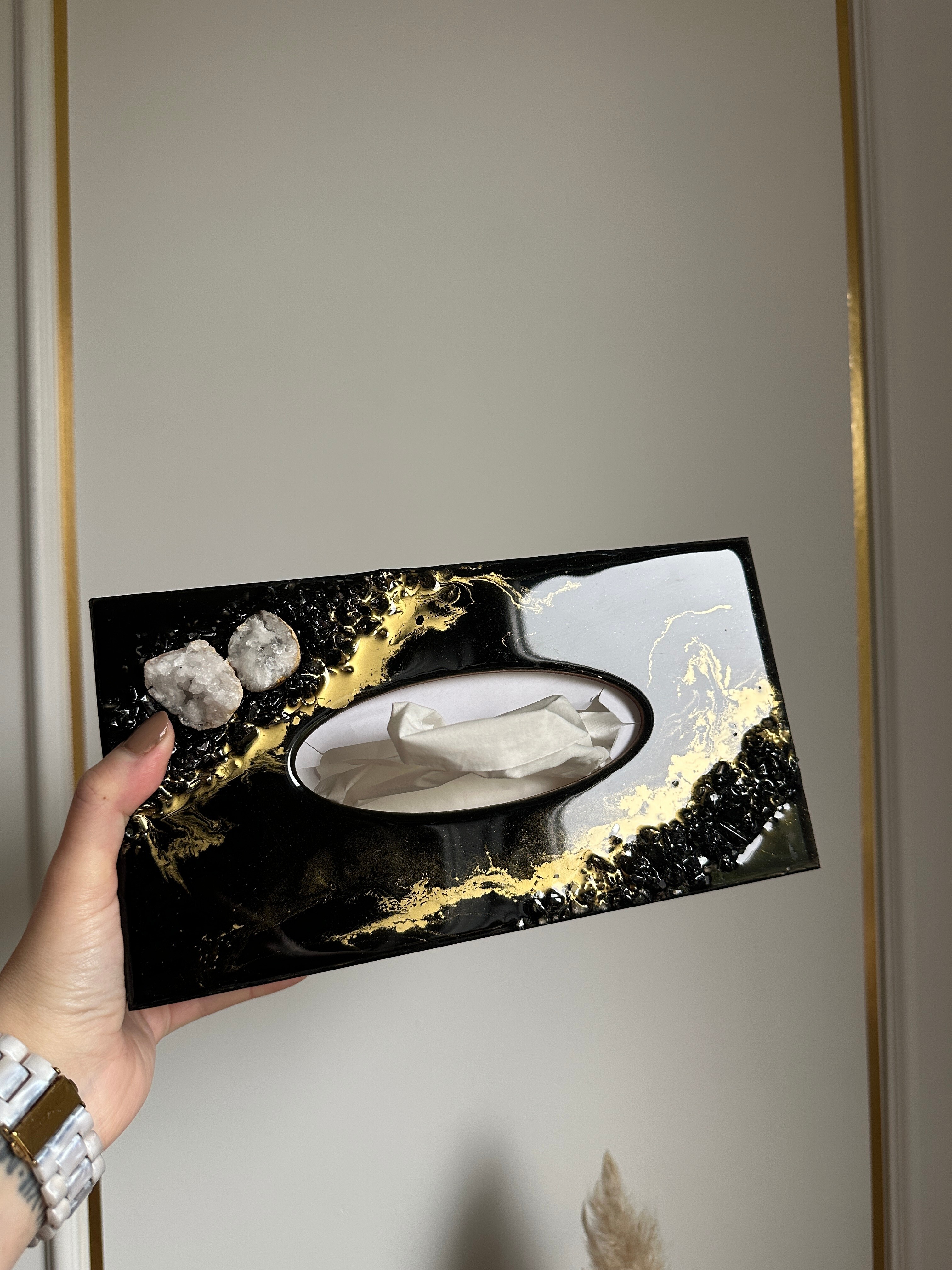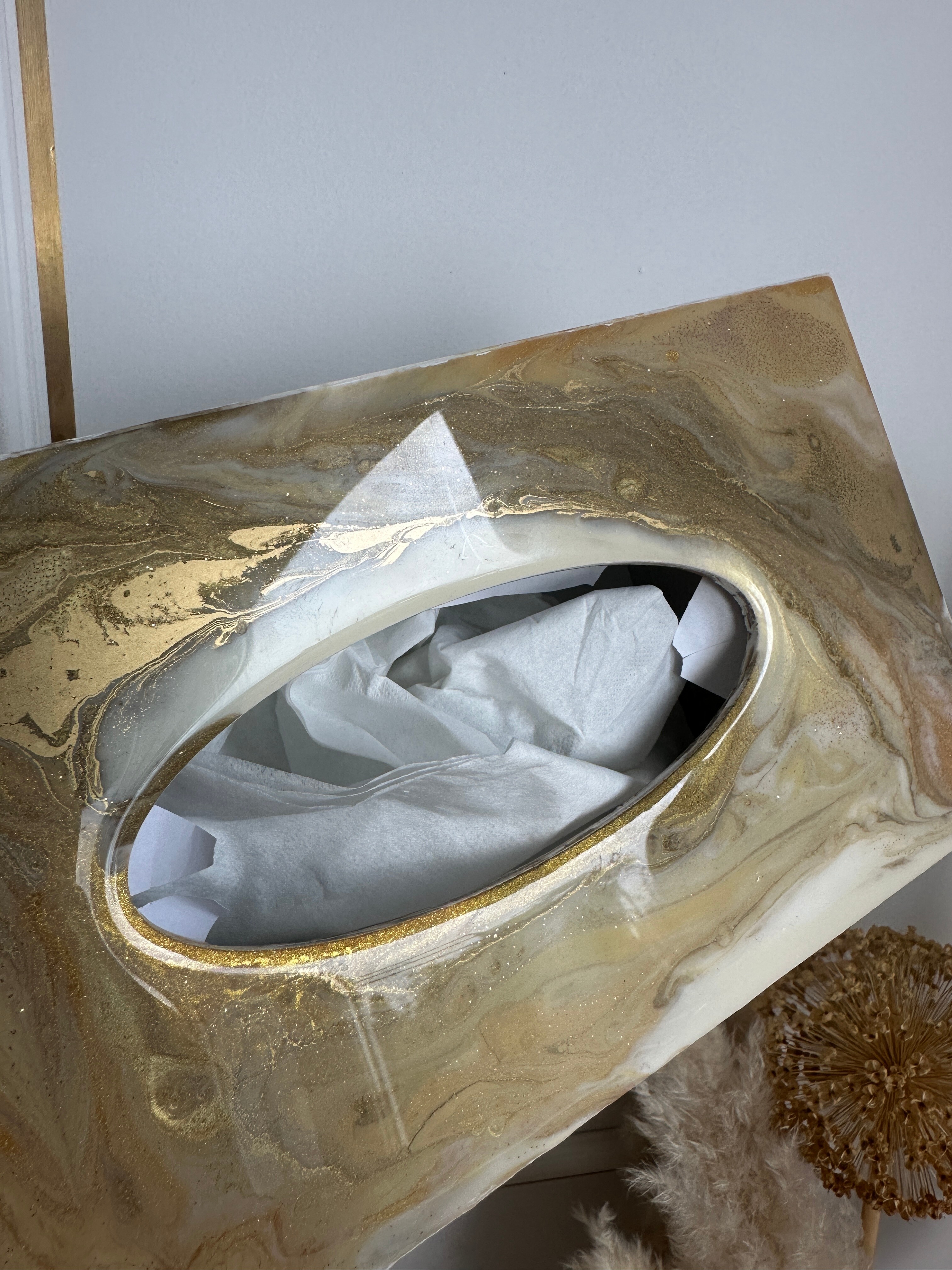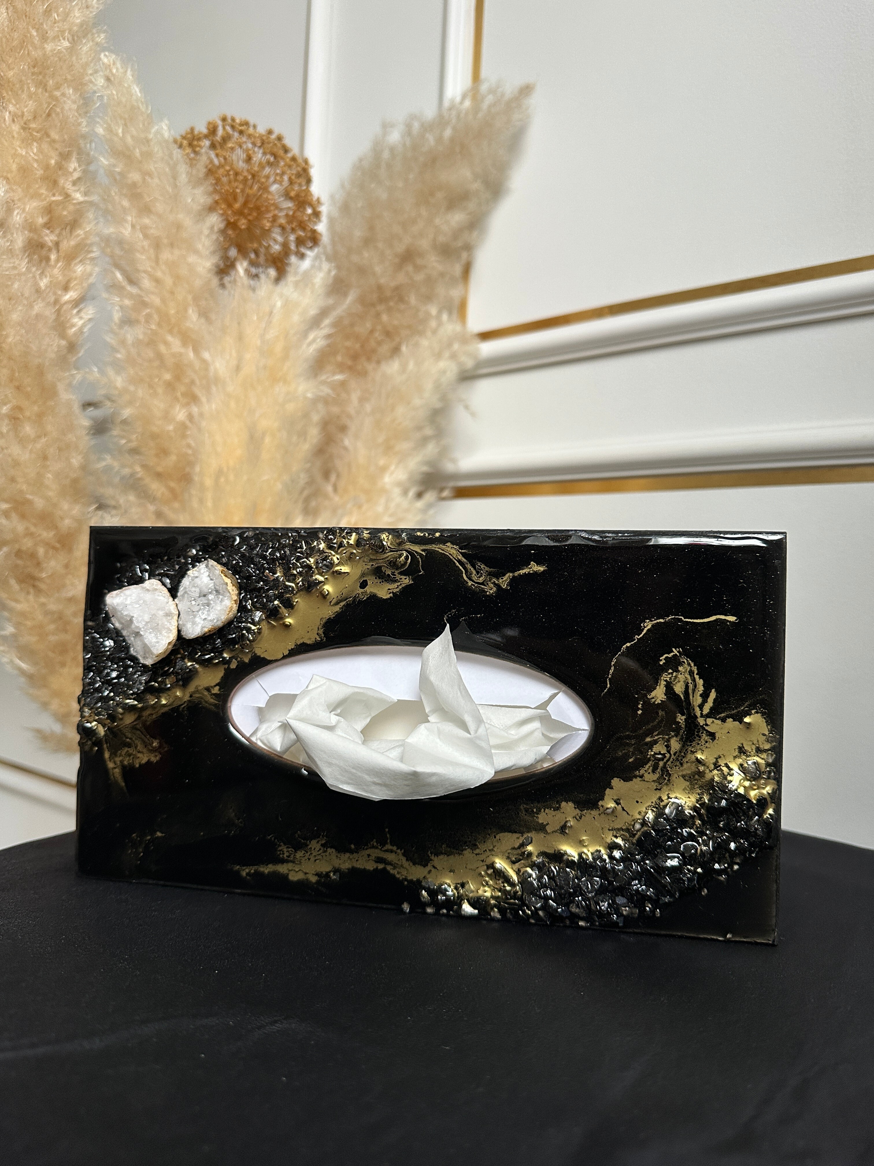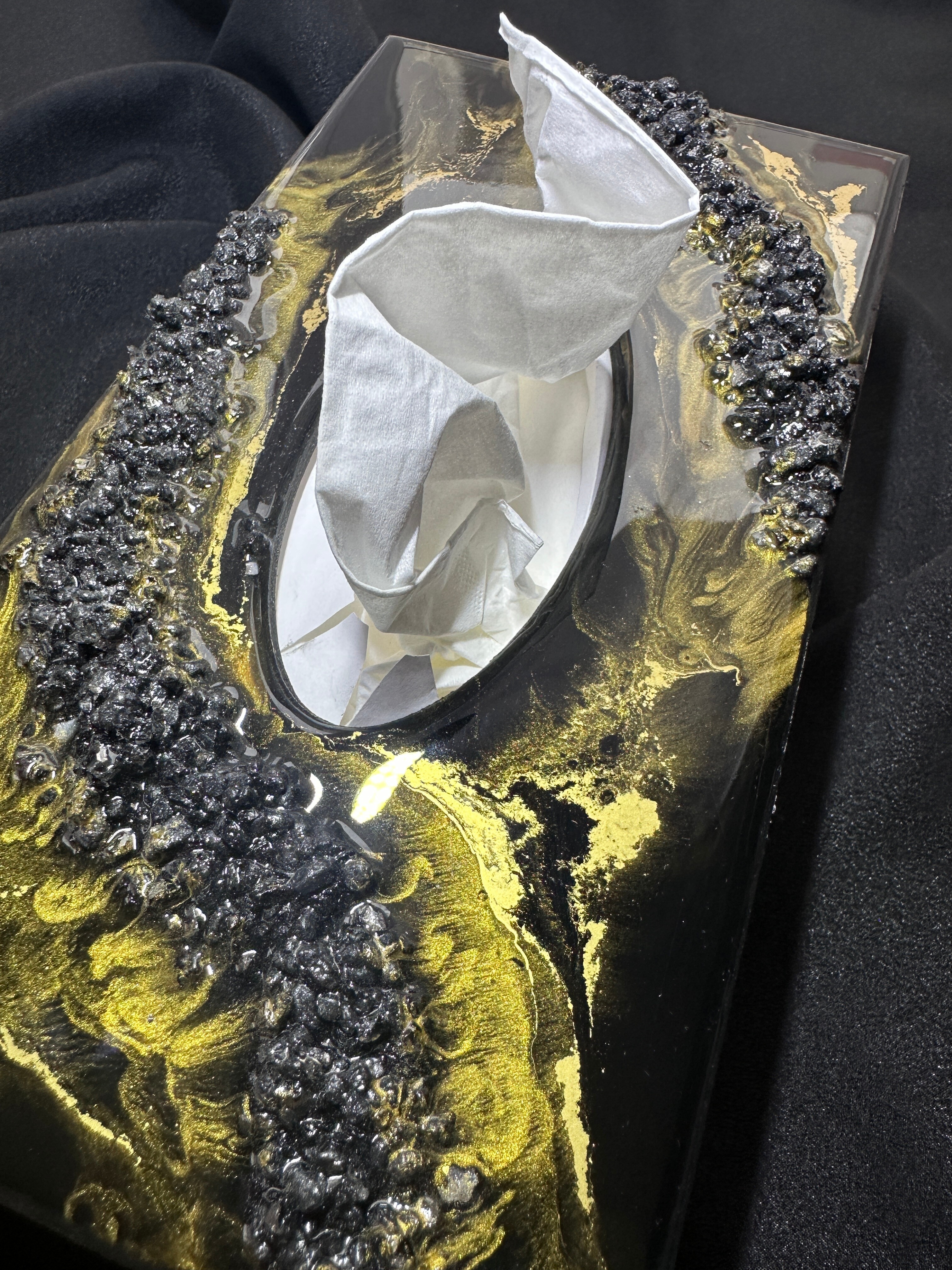 Ten niezwykły materiał, jakim jest połączenie szlachetnego drewna i krystalicznej żywicy, sprawia, że każdy egzemplarz jest absolutnie unikatowy. Całość została wykonana z najwyższą dbałość o detale. Ten produkt nadaje wnętrzu niepowtarzalnego charakteru, idealnie komponując się z wystrojem salonu czy sypialni. Nasze pojemniki na chusteczki wykonane są z pasją i precyzją, co widać w każdym detalu. Każdy egzemplarz został wykończony ręką rzemieślnika.