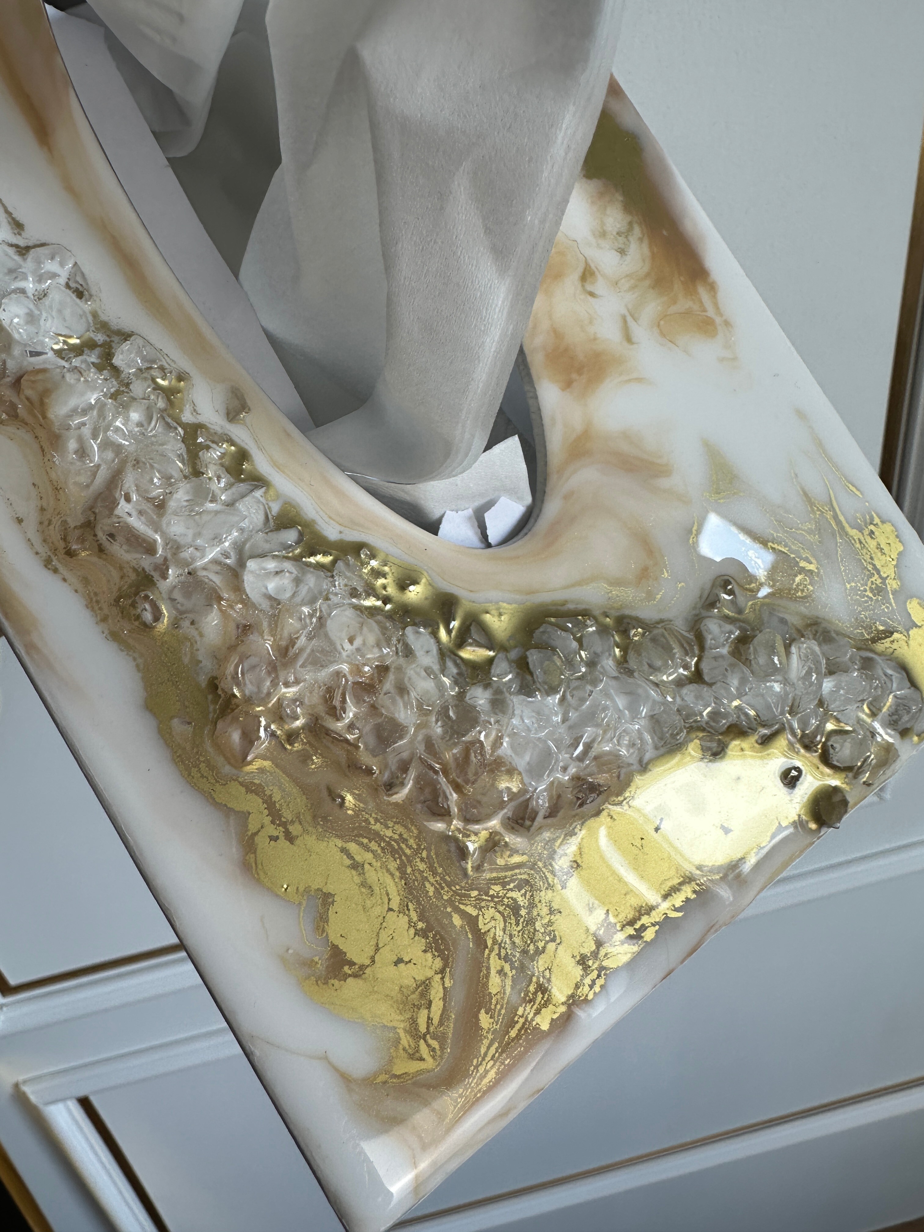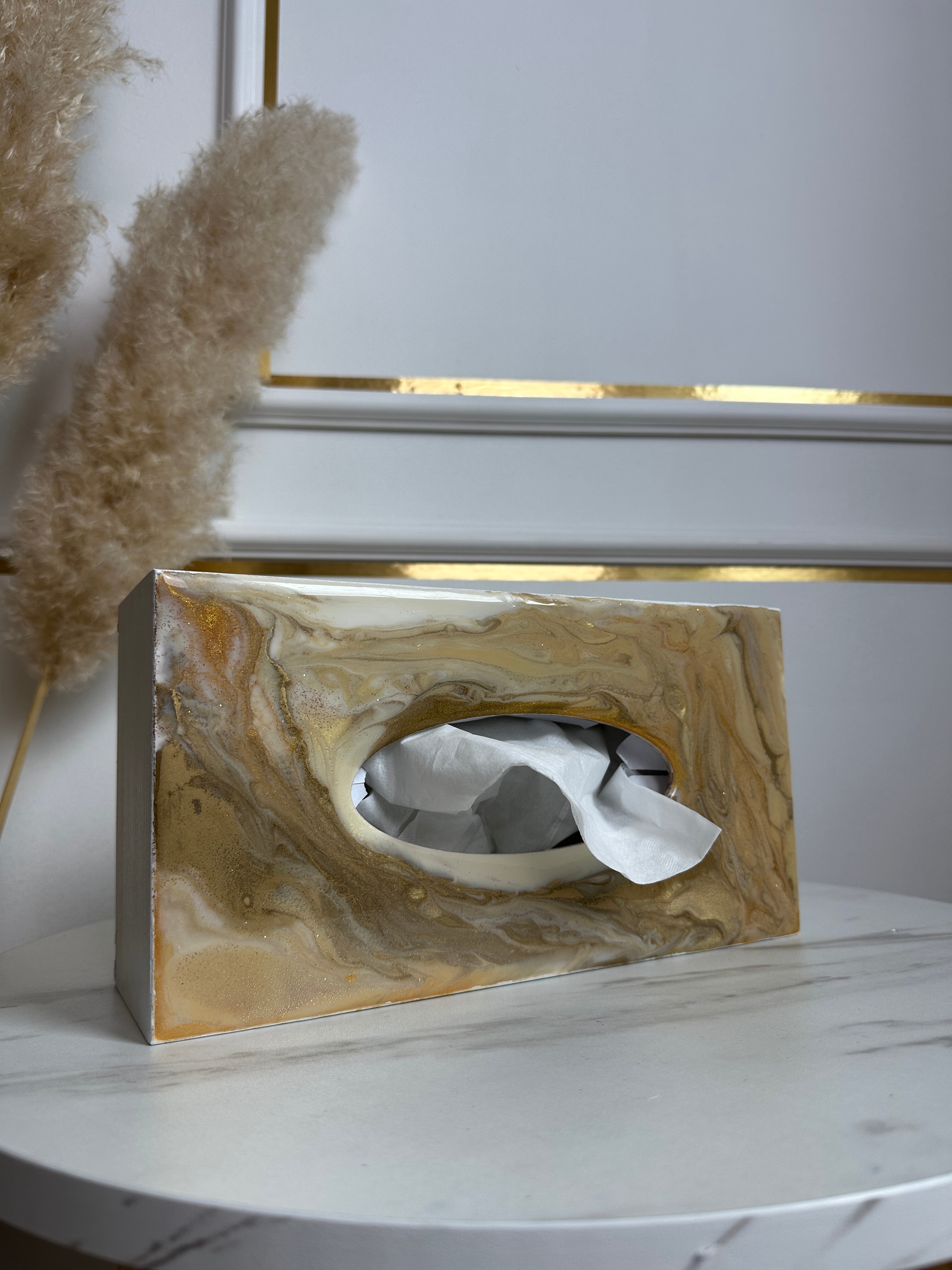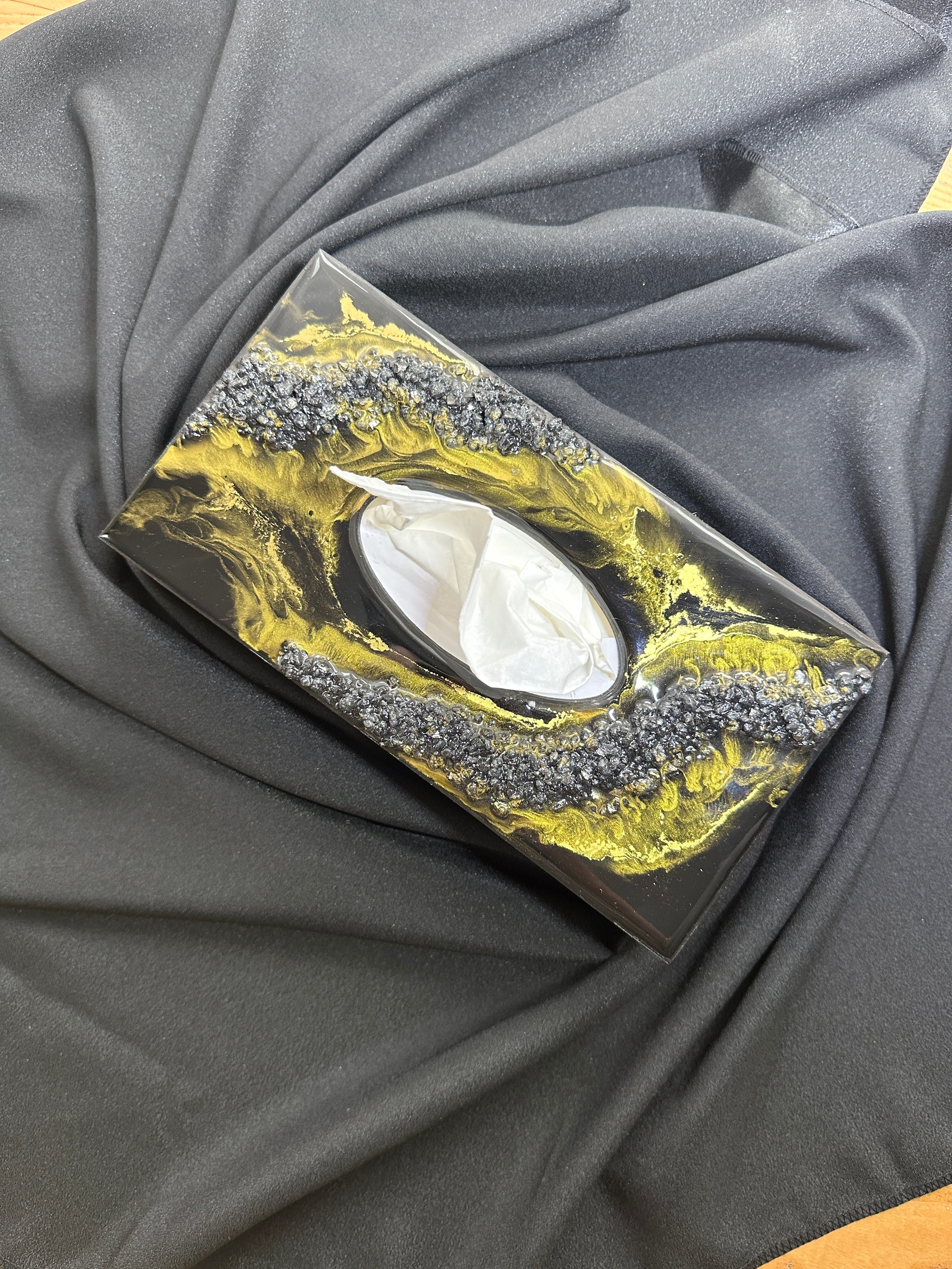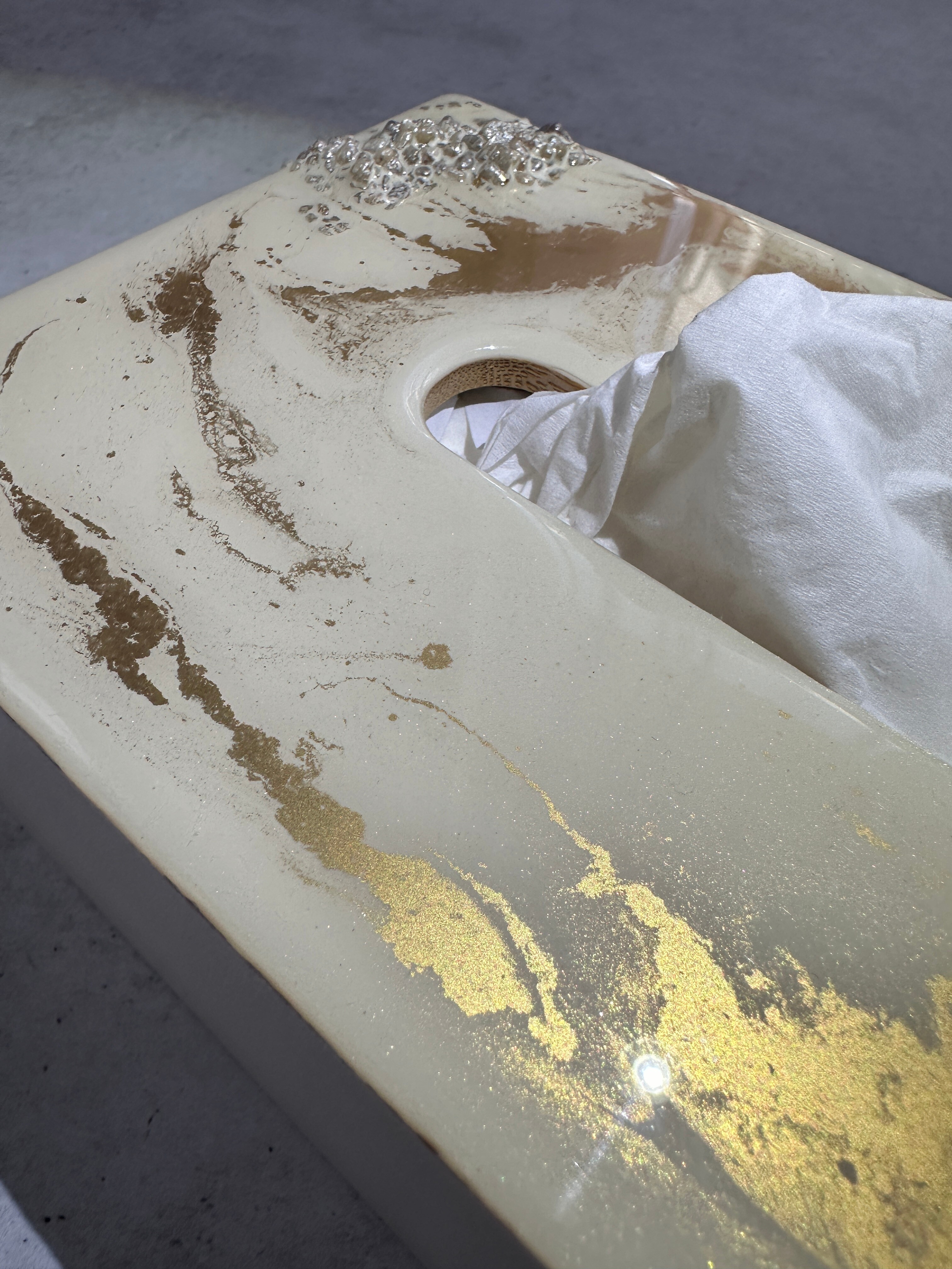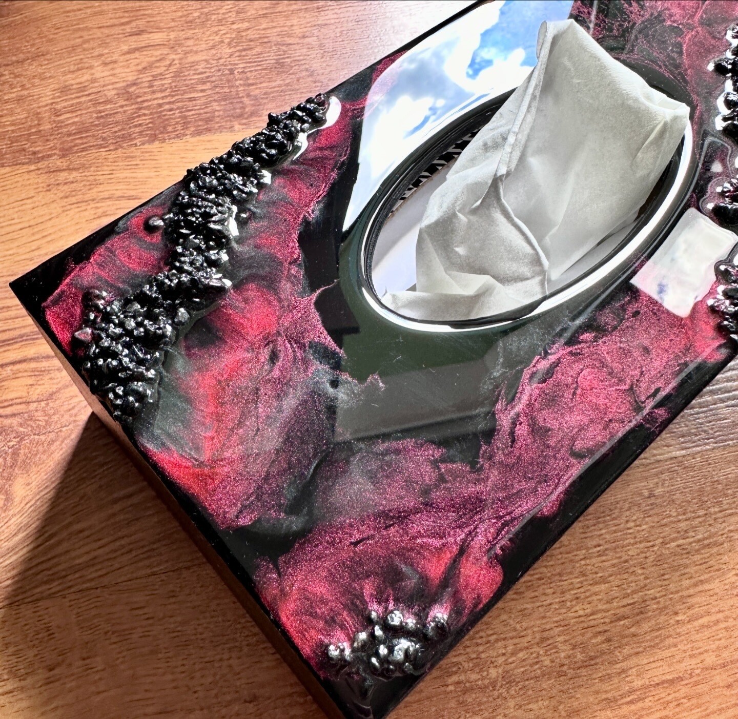 Ten niezwykły materiał, jakim jest połączenie szlachetnego drewna i krystalicznej żywicy, sprawia, że każdy egzemplarz jest absolutnie unikatowy. Całość została wykonana z najwyższą dbałość o detale. Ten produkt nadaje wnętrzu niepowtarzalnego charakteru, idealnie komponując się z wystrojem salonu czy sypialni. Nasze pojemniki na chusteczki wykonane są z pasją i precyzją, co widać w każdym detalu. Każdy egzemplarz został wykończony ręką rzemieślnika.