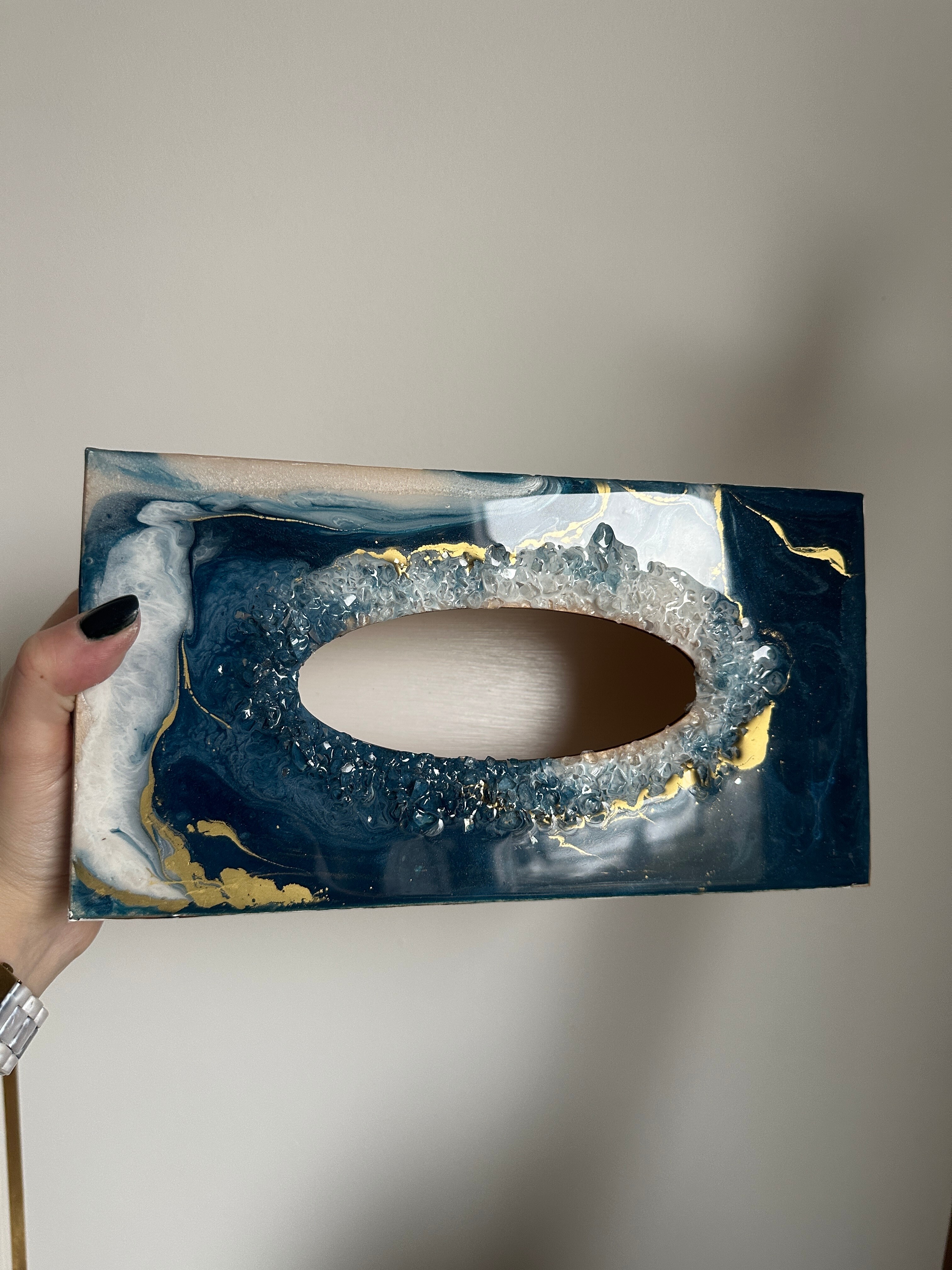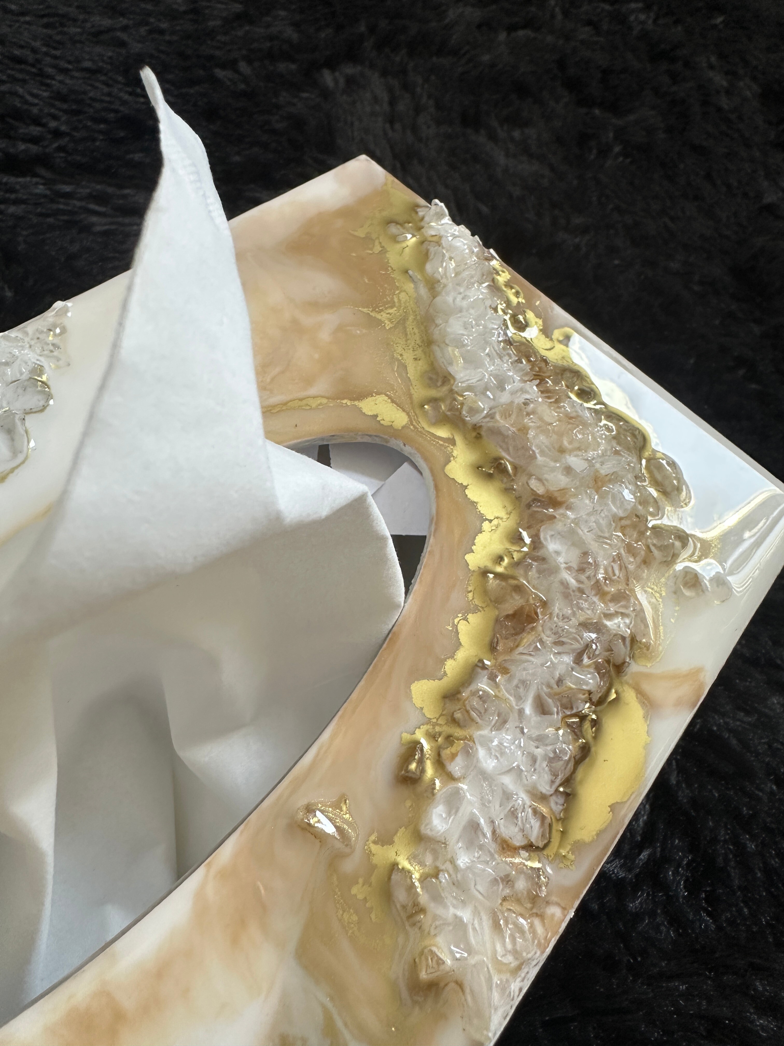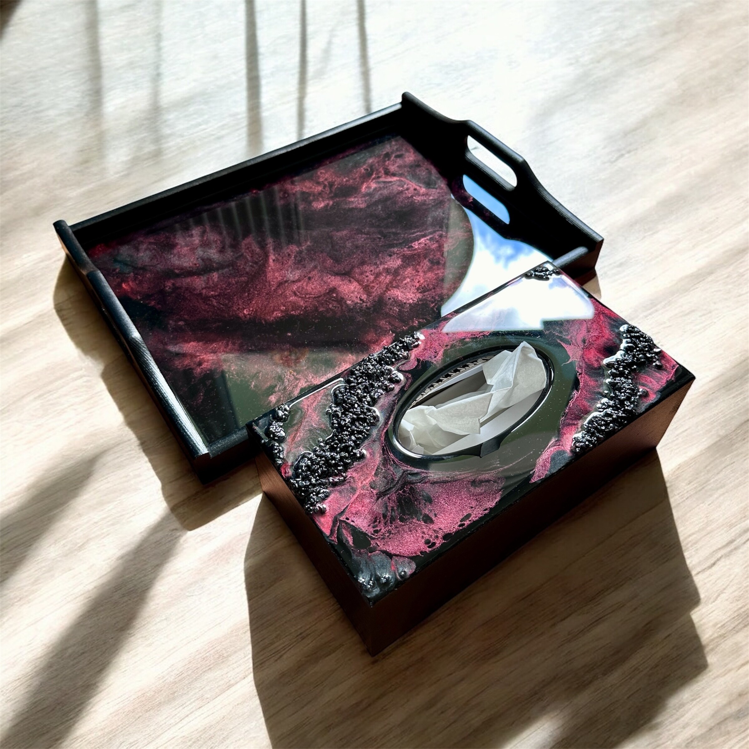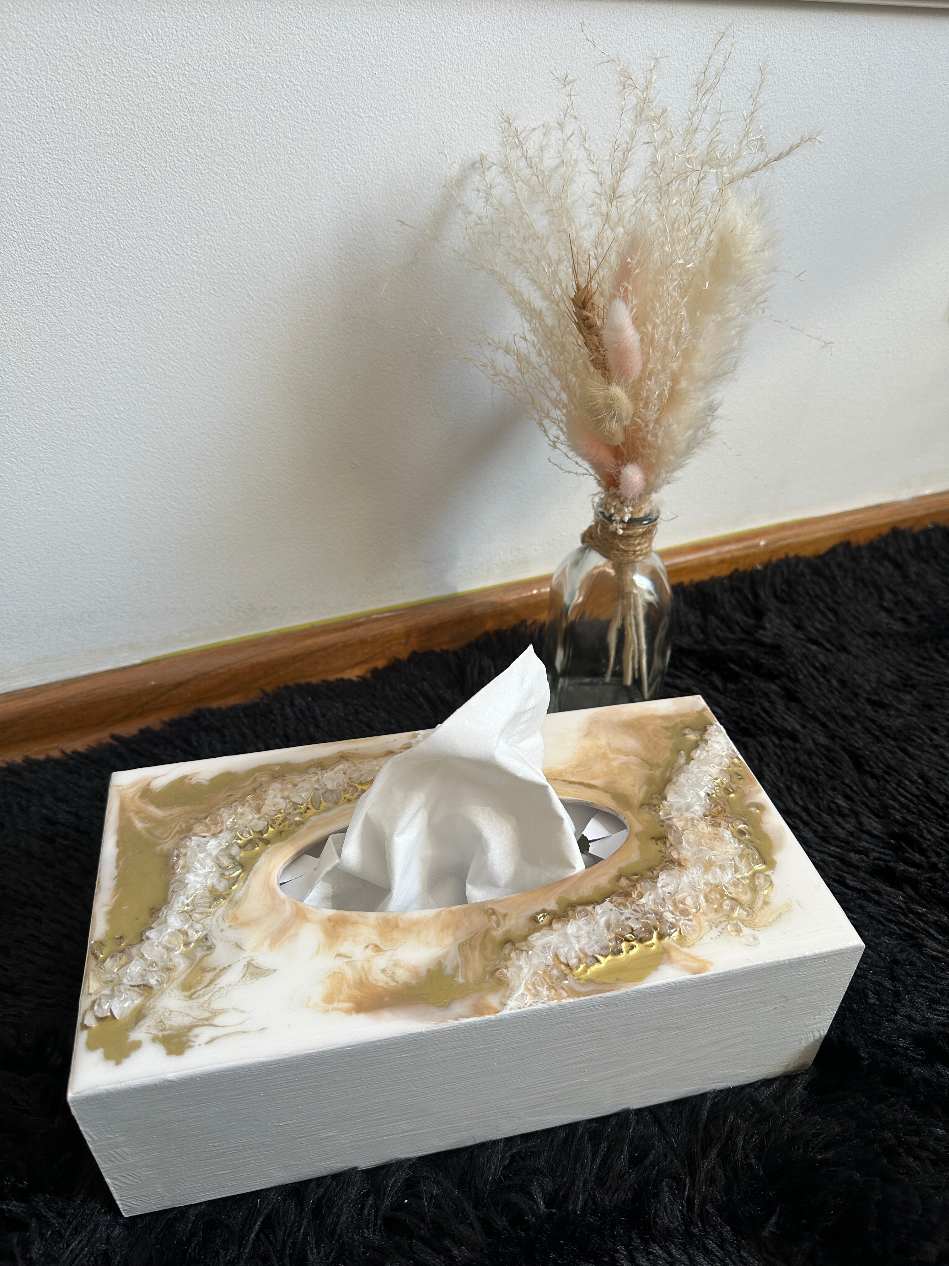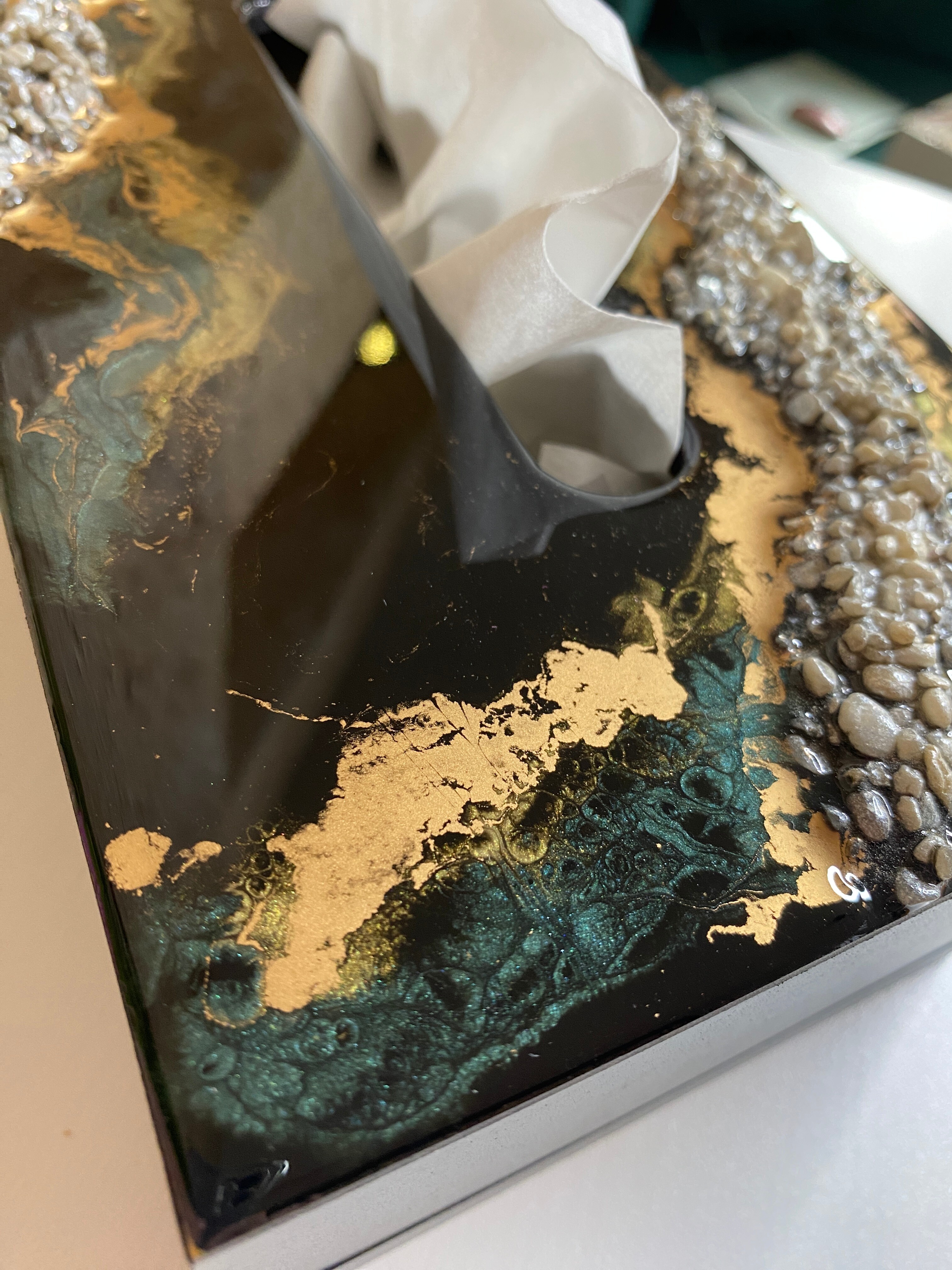 Ten niezwykły materiał, jakim jest połączenie szlachetnego drewna i krystalicznej żywicy, sprawia, że każdy egzemplarz jest absolutnie unikatowy. Całość została wykonana z najwyższą dbałość o detale. Ten produkt nadaje wnętrzu niepowtarzalnego charakteru, idealnie komponując się z wystrojem salonu czy sypialni. Nasze pojemniki na chusteczki wykonane są z pasją i precyzją, co widać w każdym detalu. Każdy egzemplarz został wykończony ręką rzemieślnika.
