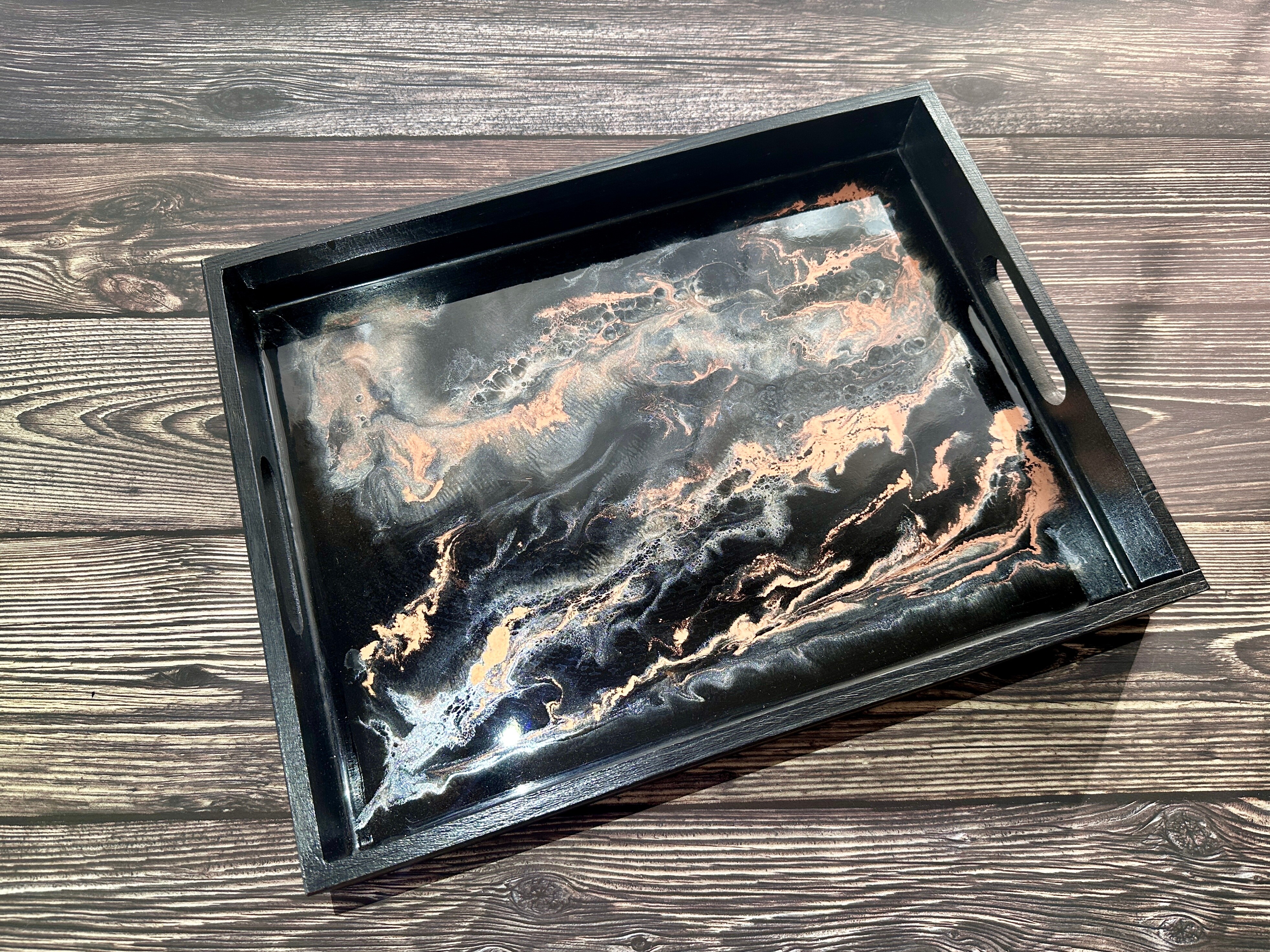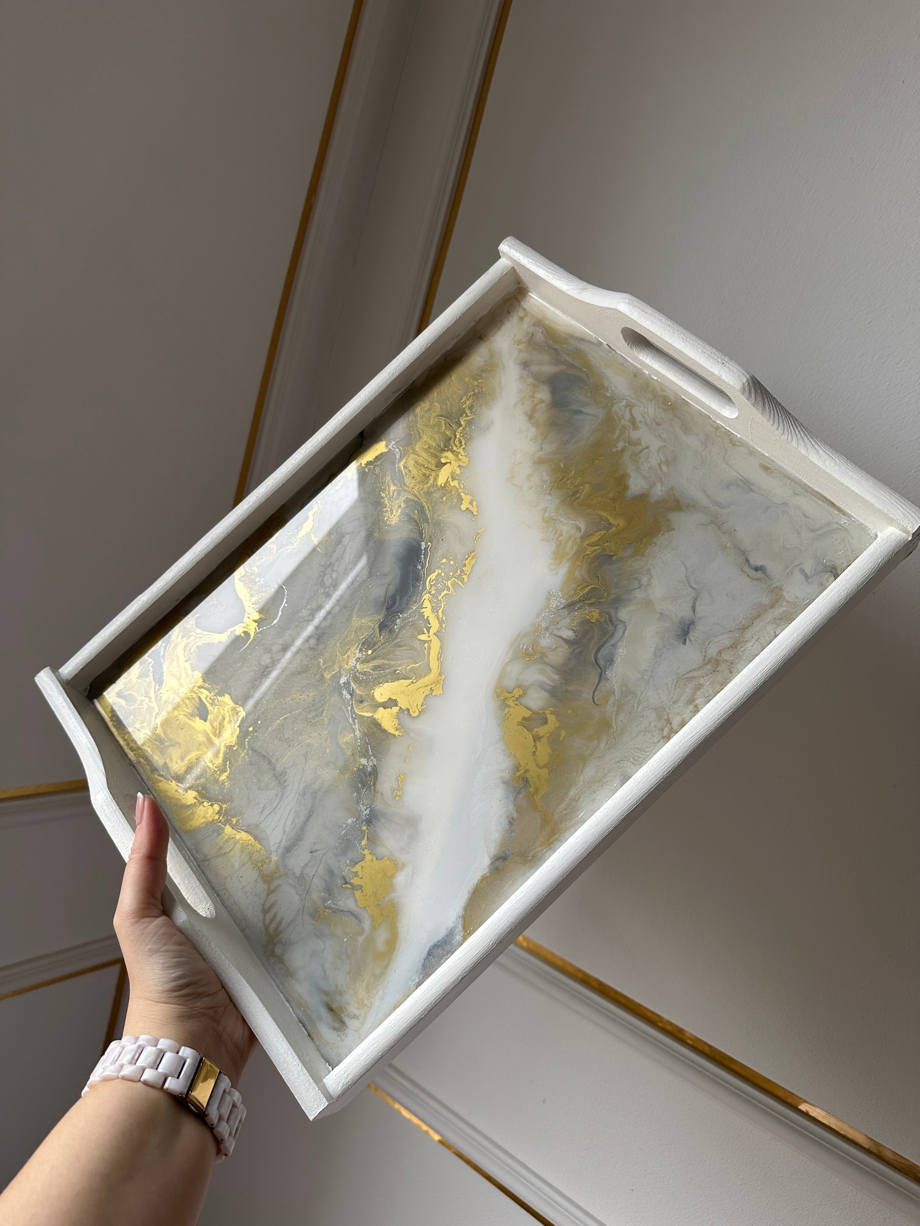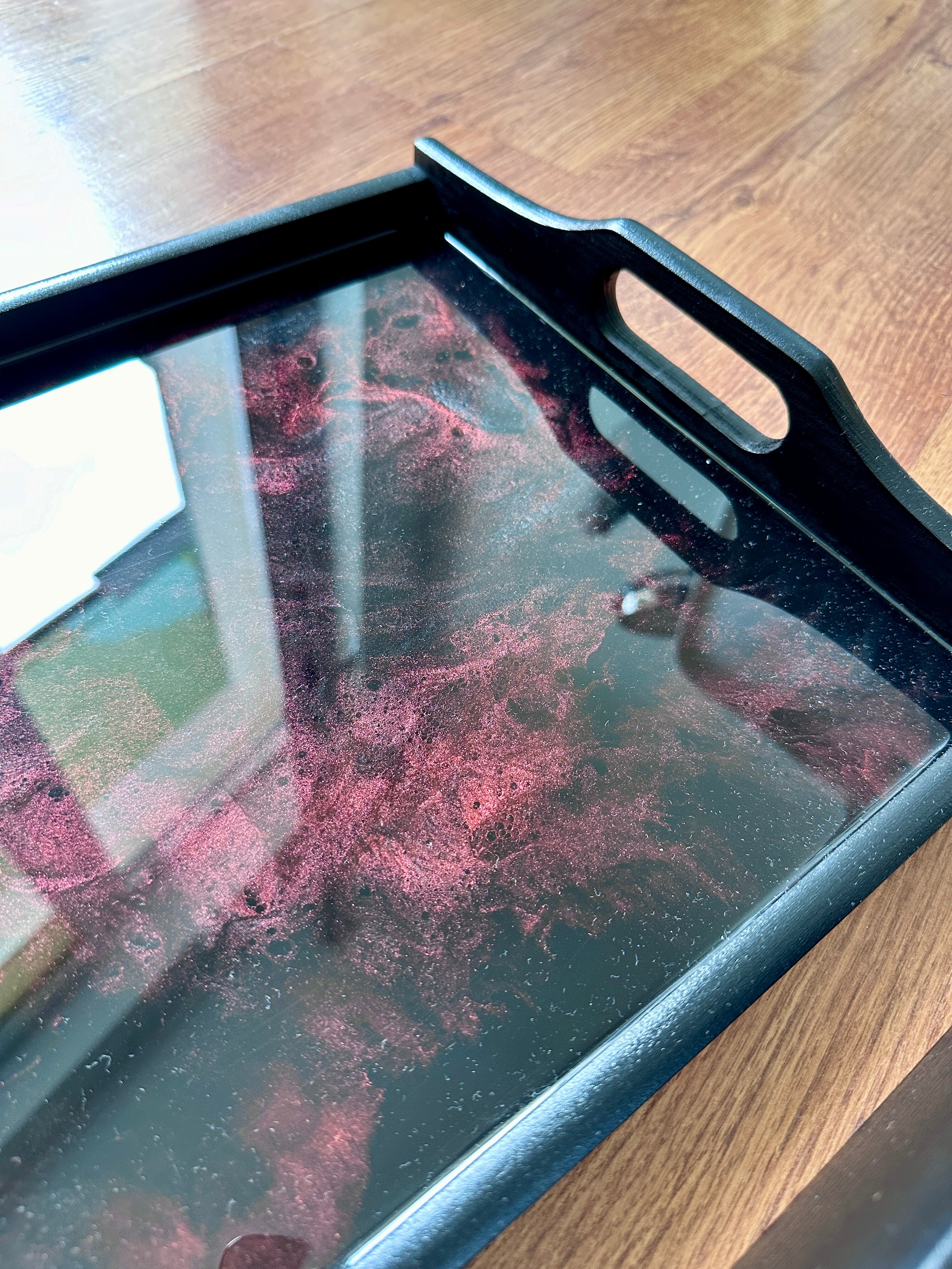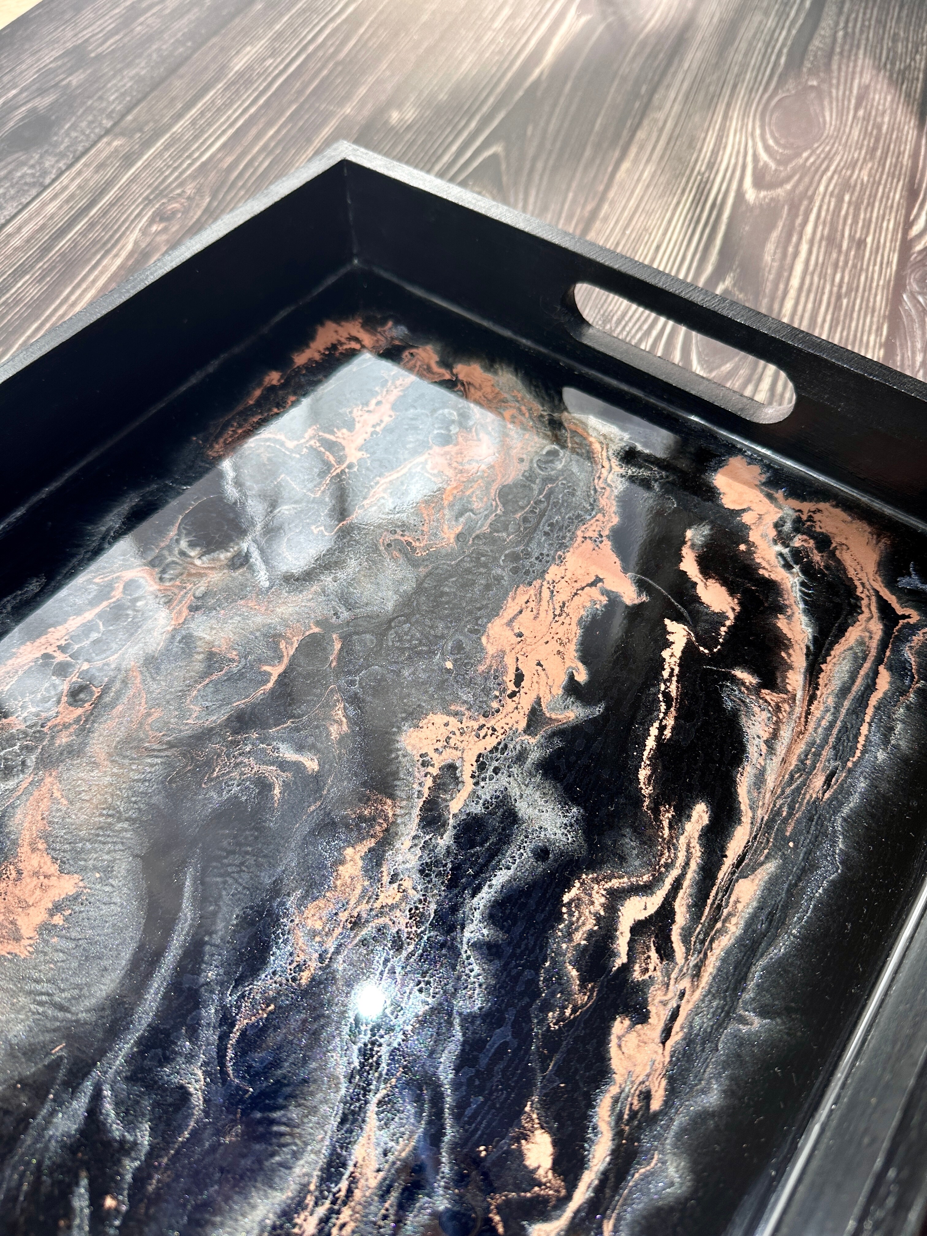 Pamiętaj, że żywica epoksydowa to materiał twardy i trwały, ale wymaga odpowiedniej pielęgnacji. Każda taca z żywicy jest przez nas starannie wykończona, a jej powierzchni jest gładka i lśniąca. Jest ona w pełni zabezpieczona specjalnym preparatem, dzięki czemu jest odporna na zarysowania przy normalnym użytkowaniu.
